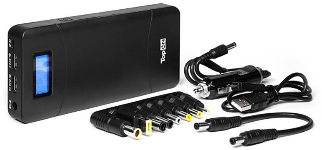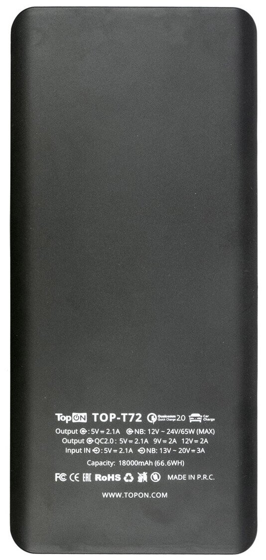 Внешний аккумулятор TopON 18000mAh (66.6Wh) QC 2.0, 2 USB для ноутбука, планшета, смартфона и аккумулятора авто. Возможность заряжать до 3-х устройств одновременно.Совместим с большинством современных ноутбуков, планшетов и смартфонов.Диапазон выходных напряжений 12V – 24V.