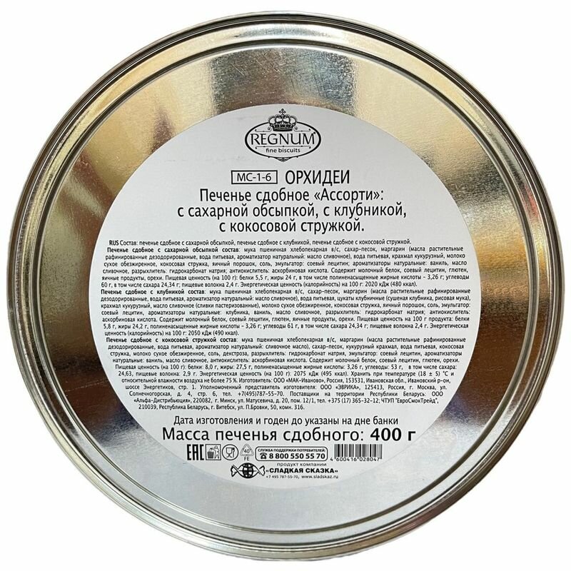 Печенье Regnum Орхидеи сдобное ассорти в сахарной обсыпке с кусочками клубники с кокосовой стружкой 400г