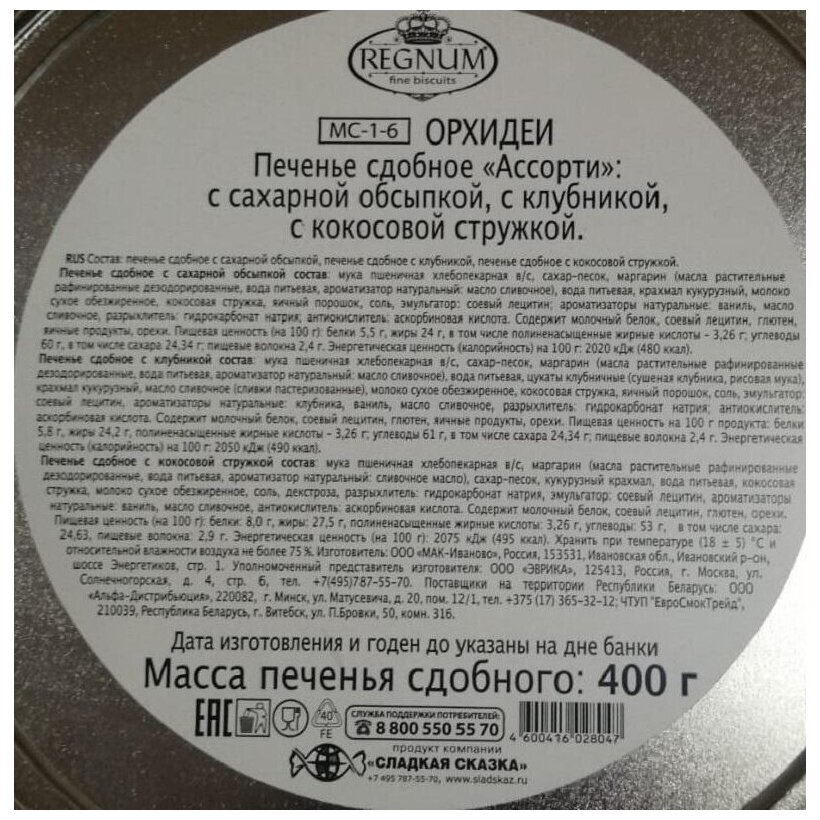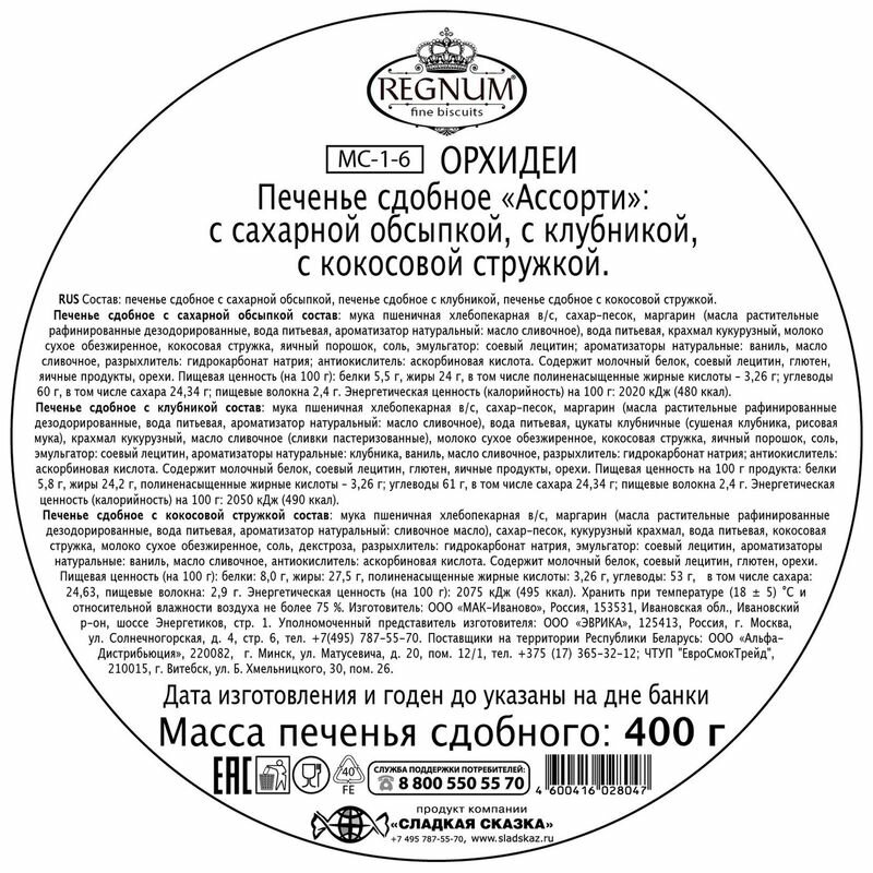 Сервис сравнения цен СкидкаГИД предлагает сравнить цены на товар «Печенье Regnum Орхидеи сдобное ассорти в сахарной обсыпке с кусочками клубники с кокосовой стружкой 400г»