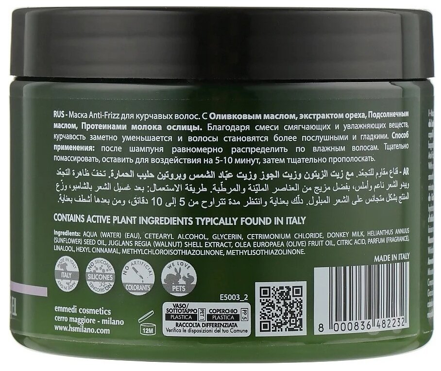 Cостав: cetearyl alcohol, glycerin, cetrimonium chloride, donkey milk, helianthus annuus seed oil, juglans regia shell extract, olea europaea fruit oil, citric acid, parfum, linalool, hexyl cinnamal, methylchloroisothiazolinone, methylisothiazolinone, aqua.