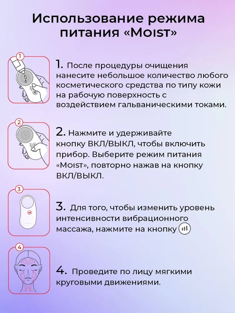Вторая рабочая поверхность с воздействием гальванических токов в режиме Moist активно питает кожу на клеточном уровне, способствует лучшему впитыванию кремов и многократно усиливает их эффективность. Такие процедуры стимулируют выработку собственного коллагена и эластина, борются со свободными радикалами, усиливают процессы регенерации кожи, а также снимают проявления стресса и аллергических реакций.