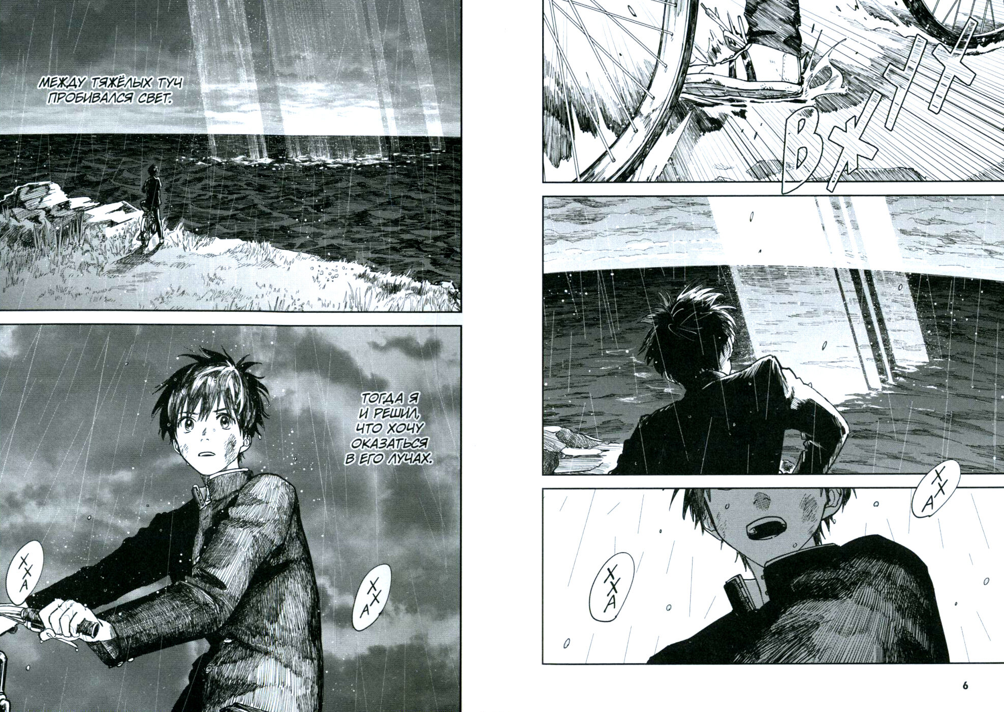 История смотрится весьма оригинально и динамично, главные герои очень приятные и интересные, было интересно наблюдать за их маленьким приключением. В целом от книг осталось много разных эмоций, но я рад, что прочитал эту историю на бумаге. Однозначно рекомендую к прочтению всем фанатам Синкая или просто любителям красивой небольшой манги)