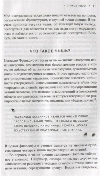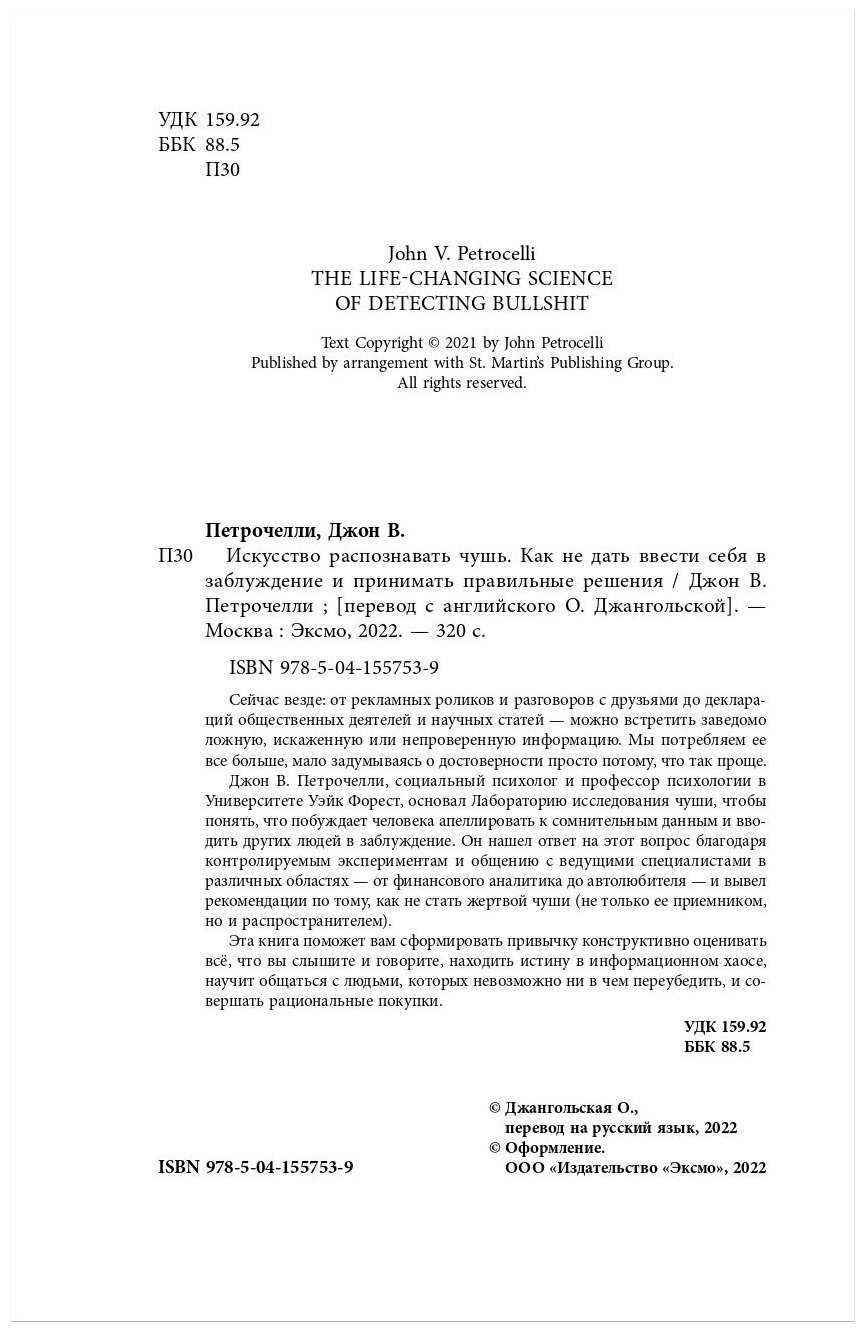 Сейчас везде: от рекламных роликов и разговоров с друзьями до деклараций общественных деятелей и научных статей — можно встретить заведомо ложную, искаженную или непроверенную информацию. Мы потребляем ее все больше, мало задумываясь о достоверности просто потому, что так проще. Джон В. Петрочелли, социальный психолог и профессор психологии в Университете Уэйк Форест основал Лабораторию Исследования Чуши, чтобы понять, что побуждает человека апеллировать к сомнительным данным и вводить других людей в заблуждение. Он нашел ответ на этот вопрос благодаря контролируемым экспериментам и общению с ведущими специалистами в различных областях — от финансового аналитика до автолюбителя — и вывел рекомендации по тому, как не стать жертвой чуши (не только ее приемником, но и распространителем). Эта книга поможет вам сформировать привычку конструктивно оценивать всё, что вы слышите и говорите, находить истину в информационном хаосе, научит общаться с людьми, которых невозможно ни в чем переубедить и совершать рациональные покупки.