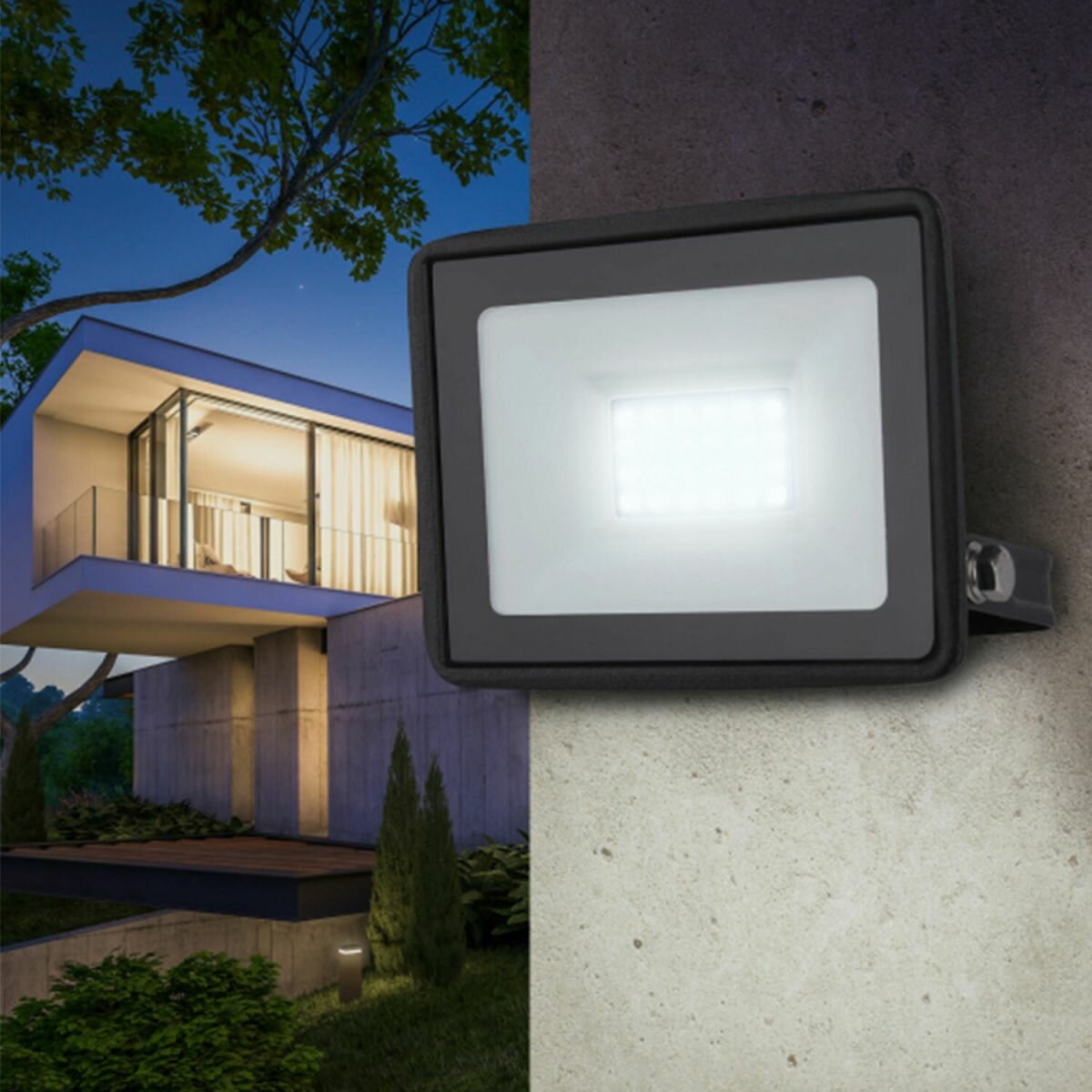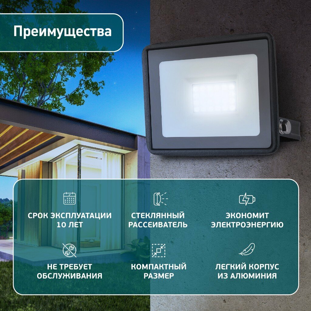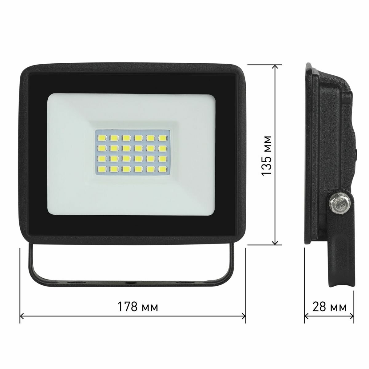Прожектор светодиодный уличный с высоким световым потоком. Корпус черный, изготовлен из прочного алюминия, стекло закаленное. Экономичная LED-технология сократит до 90% затрат на электроэнергию. Прожектор устойчив к механическим воздействиям, защищен от дождя и пыли, работает при широком диапазоне температур (от -40 до +45°С). Отличается простой и быстрой установкой: есть кронштейн специальной формы и регулировочные болты для выбора направления света. Подходит как для внутреннего, так и для наружного применения.