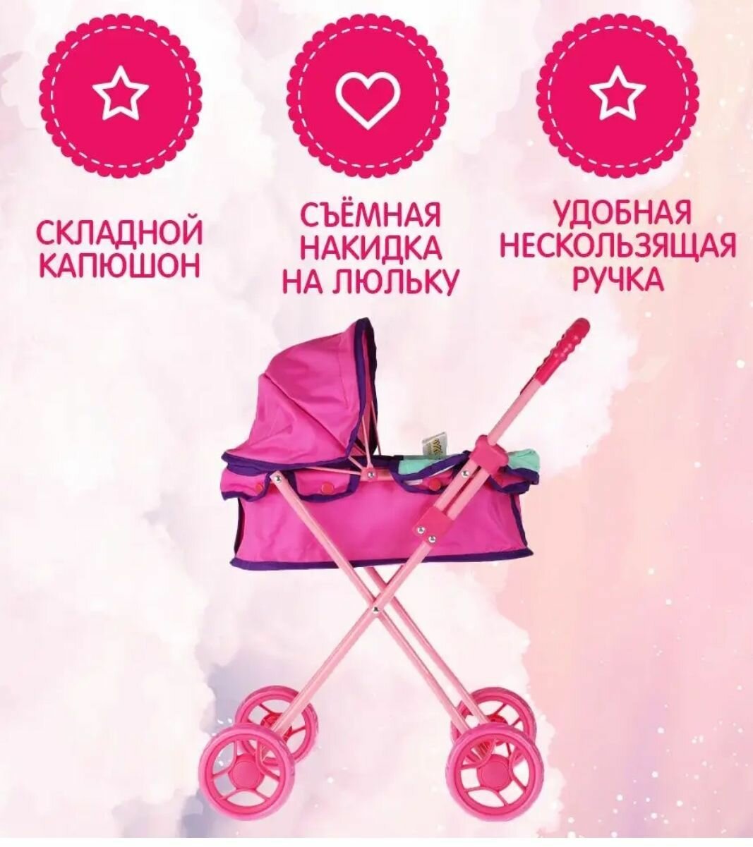 металлическая рама, складная конструкция, 4 мягких колеса диаметром 10 см, широкие бортики, складной капюшон, съёмная защитная накидка на люльку, удобная нескользящая ручка, красивый дизайн с изображением любимых героев.