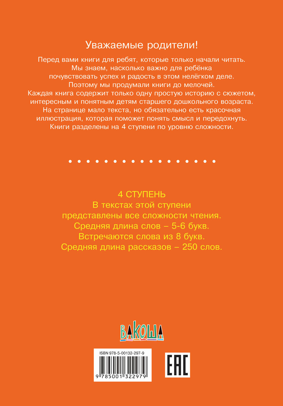 Это книги для детей, которые только начали читать. Мы знаем, насколько важно для ребёнка почувствовать успех и радость в этом нелёгком деле. Поэтому книги продуманы до мелочей. Каждая книга содержит только одну простую историю с сюжетом, интересным и понятным детям старшего дошкольного возраста. На странице мало текста, но обязательно есть красочная иллюстрация, которая поможет понять смысл и передохнуть. Книги разделены на 4 ступени по уровню сложности. В текстах этой ступени представлены все сложности чтения. Средняя длина слов - 5-6 букв. Встречаются слова из 8 букв. Средняя длина рассказов - 250 слов.