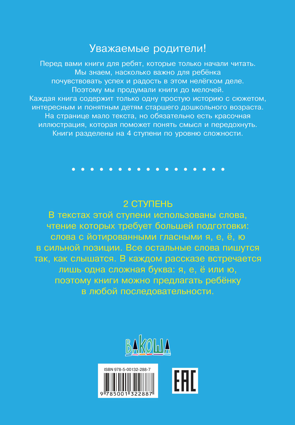 Это книги для детей, которые только начали читать. Мы знаем, насколько важно для ребёнка почувствовать успех и радость в этом нелёгком деле. Поэтому книги продуманы до мелочей. Каждая книга содержит только одну простую историю с сюжетом, интересным и понятным детям старшего дошкольного возраста. На странице мало текста, но обязательно есть красочная иллюстрация, которая поможет понять смысл и передохнуть. Книги разделены на 4 ступени по уровню сложности. В текстах этой ступени использованы слова, чтение которых требует большей подготовки: слова с йотированными гласными я, е, ё, ю в сильной позиции. Все остальные слова пишутся так, как слышатся. В каждом рассказе встречается лишь одна сложная буква: я, е, ё или ю, поэтому книги можно предлагать ребёнку в любой последовательности.