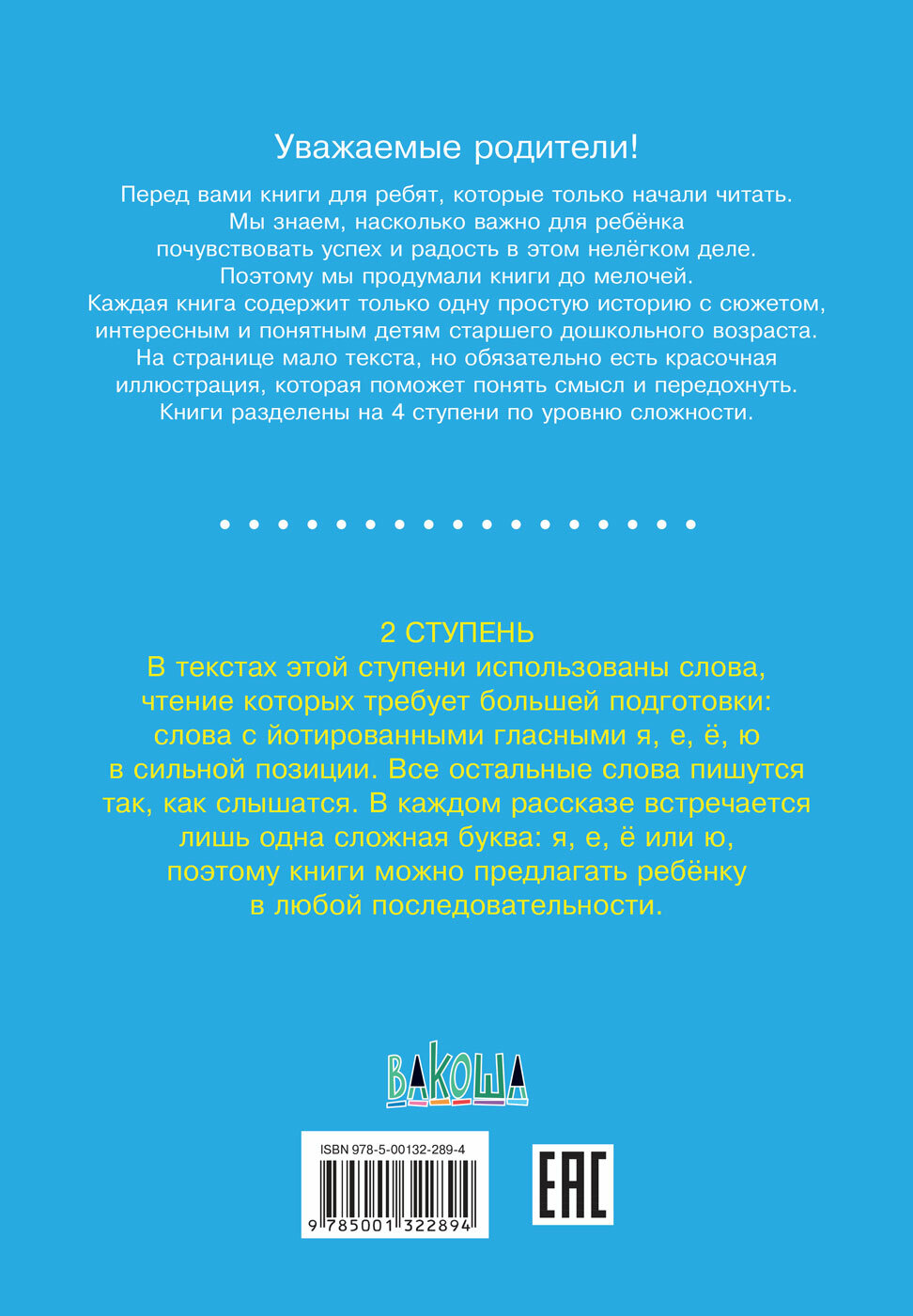 Это книги для детей, которые только начали читать. Мы знаем, насколько важно для ребёнка почувствовать успех и радость в этом нелёгком деле. Поэтому книги продуманы до мелочей. Каждая книга содержит только одну простую историю с сюжетом, интересным и понятным детям старшего дошкольного возраста. На странице мало текста, но обязательно есть красочная иллюстрация, которая поможет понять смысл и передохнуть. Книги разделены на 4 ступени по уровню сложности. В текстах этой ступени использованы слова, чтение которых требует большей подготовки: слова с йотированными гласными я, е, ё, ю в сильной позиции. Все остальные слова пишутся так, как слышатся. В каждом рассказе встречается лишь одна сложная буква: я, е, ё или ю, поэтому книги можно предлагать ребёнку в любой последовательности.