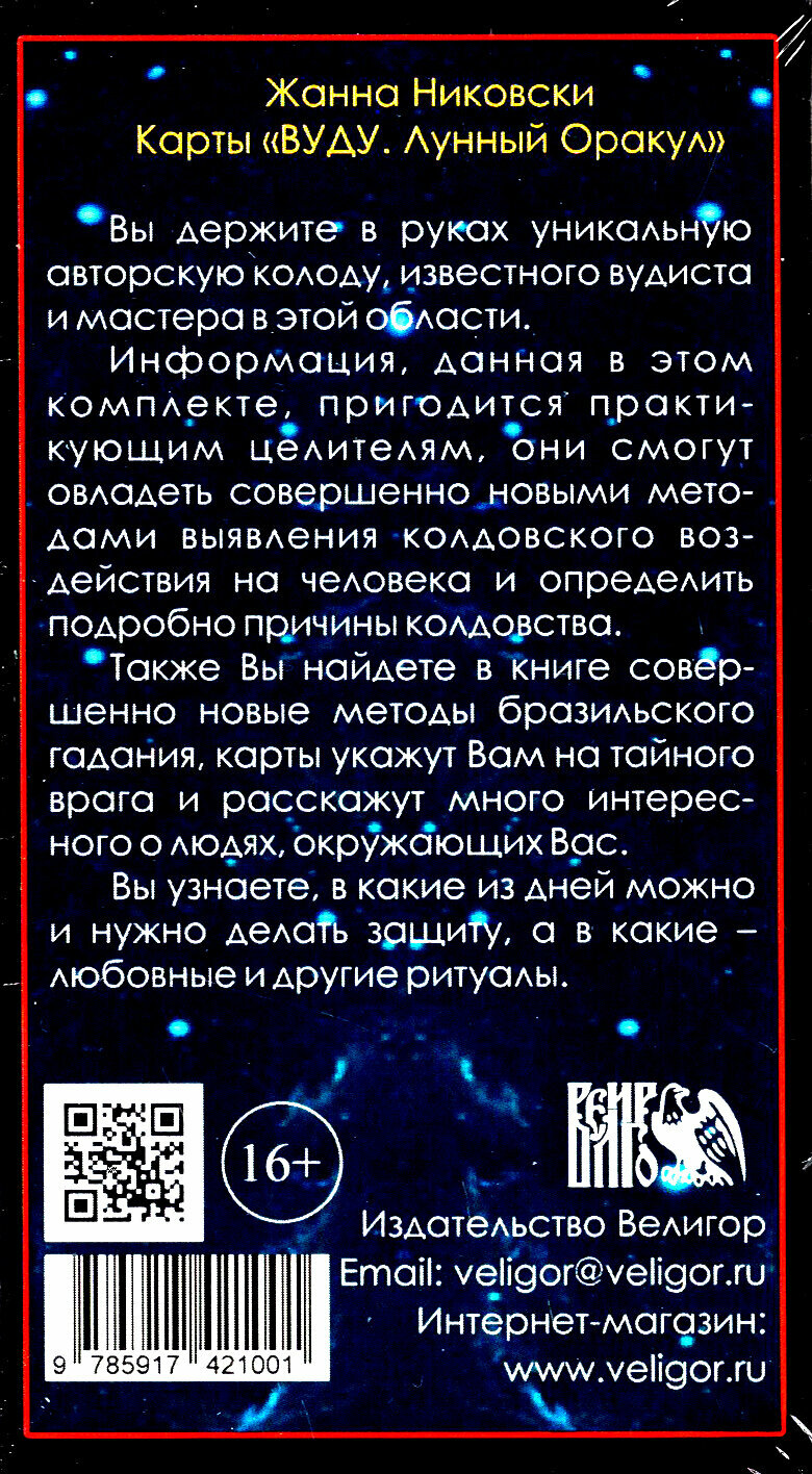 Колода карт "ВУДУ Лунный оракул", которая включает в себя карты (оракул), их подробное описание и техники работы с ними. Для каждого, интересующегося данной темой этот материал станет уникальным источником для работы во время предсказаний. Представленная работа позволит проводить не только анализ ситуаций, но и станет вашим настольным инструментом, с помощью которого Вы сможете изменить к лучшему свою жизнь и жизнь близких вам людей, избежать "черных дней" и ошибок, отвести беду. Информация, данная в этом труде, пригодится и практикующим целителям. Они смогут овладеть совершенно новыми методами выявления колдовского воздействия на человека и определить подробно причины колдовства. Также Вы найдете в книге совершенно новые методы бразильского гадания, карты укажут Вам на тайного врага и расскажут много интересного о людях, окружающих Вас. Вы узнаете, в какие из дней можно и нужно делать защиту, а в какие - любовные и другие ритуалы.