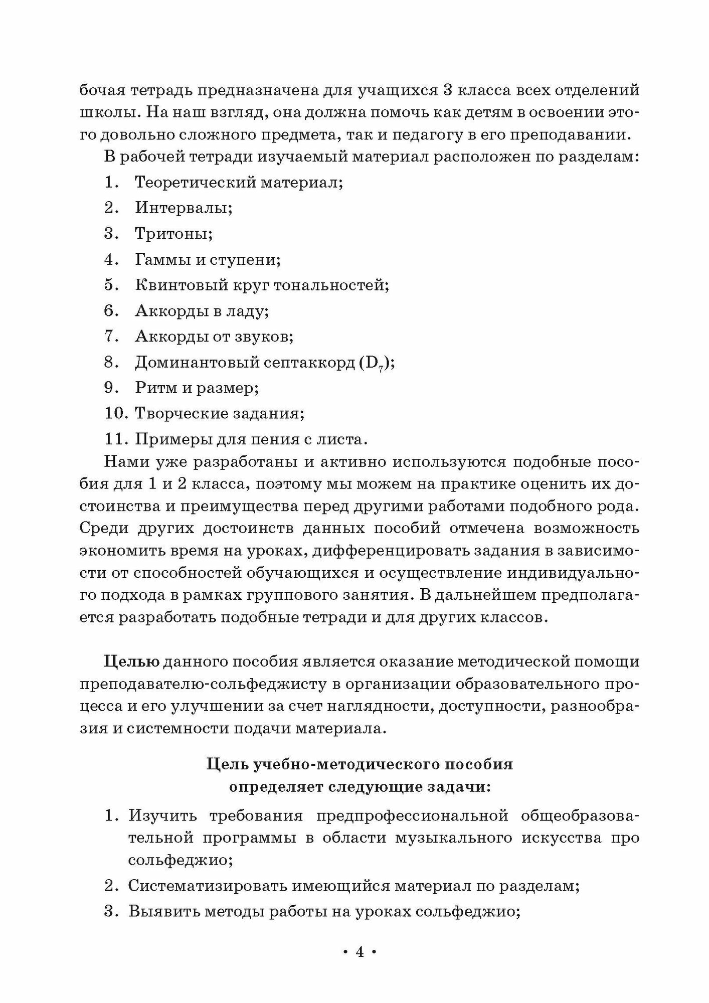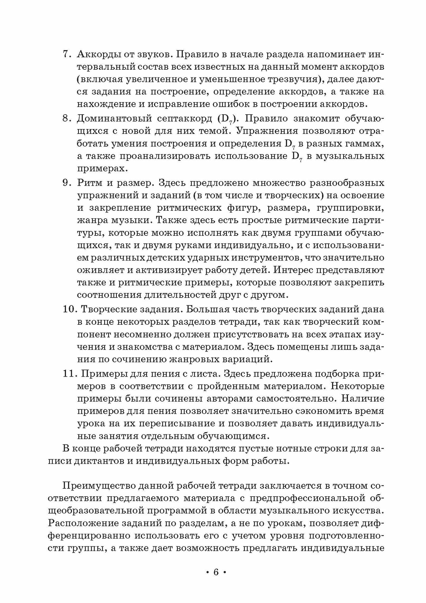 Рабочая тетрадь по сольфеджио представляет собой комплексное пособие, в котором собраны воедино и правила, и примеры для пения, и домашние задания. Материал расположен по мере прохождения тем. Среди главных достоинств пособия — возможность экономить время на уроках, дифференцировать задания в зависимости от способностей обучающихся и осуществление индивидуального подхода в рамках группового занятия.