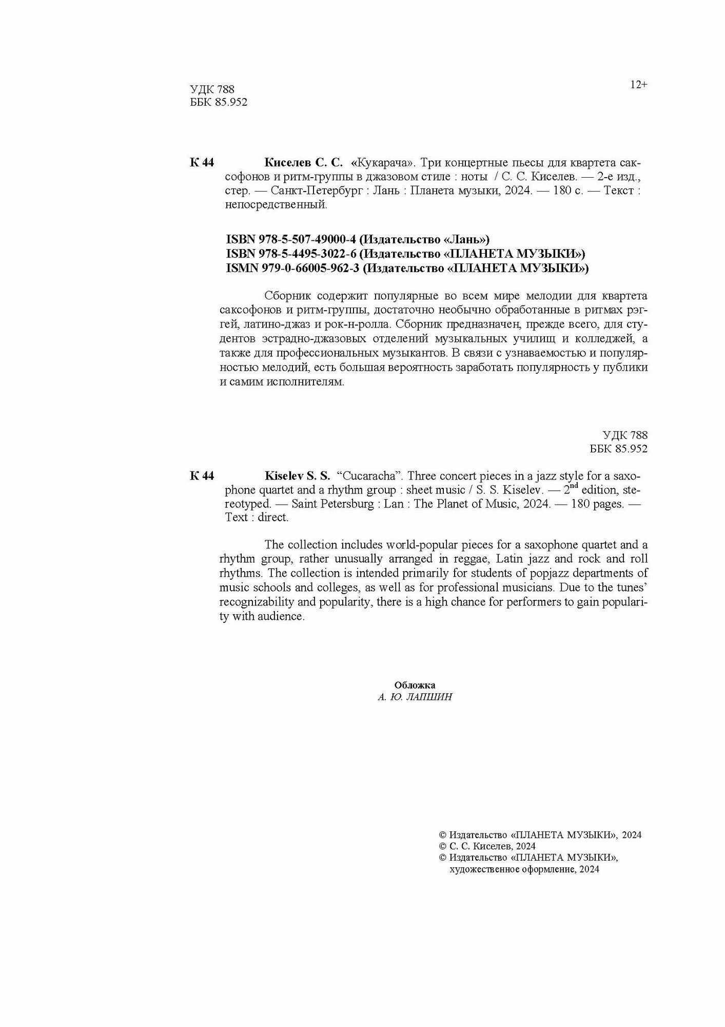 «Кукарача».Три концерт.пьесы для квартета саксофон (Киселев Станислав Семенович); Планета музыки, 2022