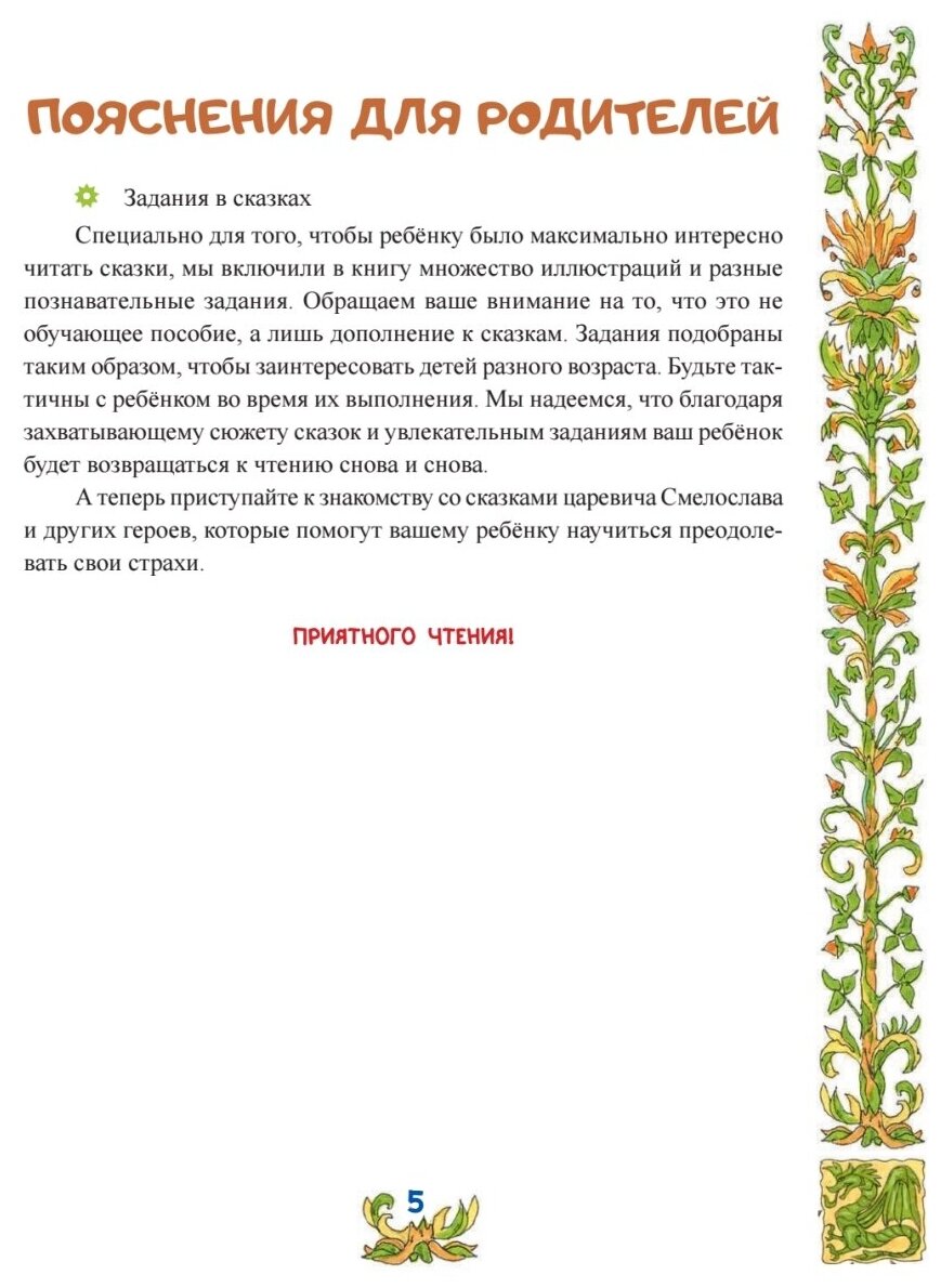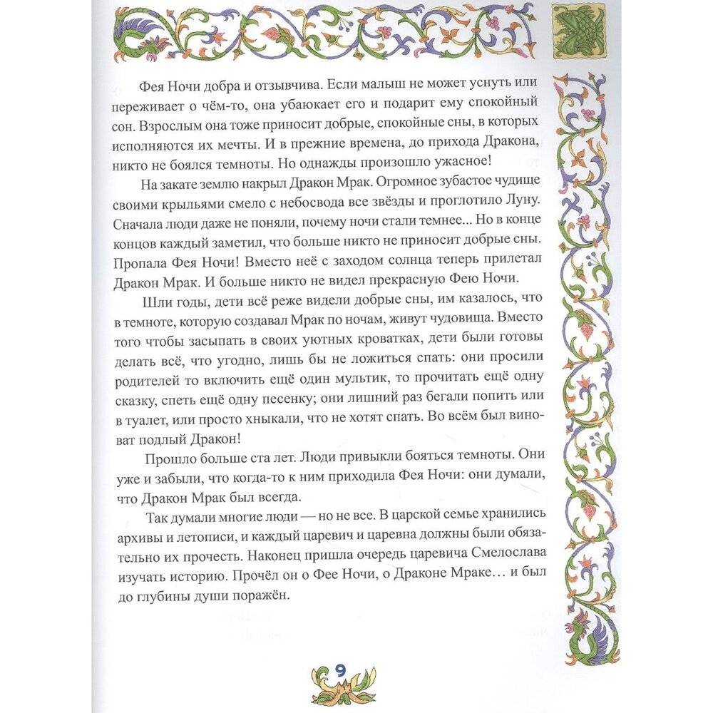 Эта книга из цикла "Сказки для Умнички" рассказывает о приключениях маленького, но очень храброго Царевича Смелослава, победившего Ночного Дракона и спасшего Фею Добрых Снов.