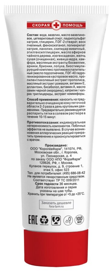 | Состав | вода, вазелин, масло вазелиновое, цетеариловый спирт, лаурилсульфат натрия, глицерин, ПЭГ-2 стеарат, воск пчелиный, феноксиэтанол, полиакрилат натрия, ланолин, скипидар живичный, этилгексилглицерин, масло эфирное чайного дерева, изогексадекан, желчь сухая (очищенная), живица кедра, камфора, масляные экстракты босвеллии, арники, брионии, лопуха, биостимулирующий комплекс противовоспалительный (масло подсолнечное, ПЭГ-40 гидрогенизированное касторовое масло, пропиленгликолевый экстракт прополиса, масляный экстракт ромашки, витамин Е, аллантоин, бисаболол, витамин А, масло семян черной смородины), каприлик / каприк триглицериды, экстракт коммифоры. |