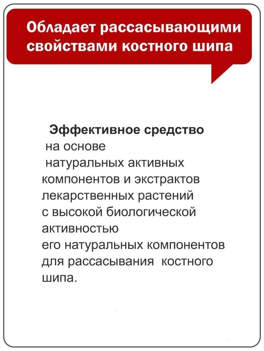 Эффективное средство на основе натуральных активных компонентов и экстрактов лекарственных растений. Обладает противовоспалительным действием, способствует нормализации функционального состояния и рассасывающими костный шип свойствами. Действие бальзама для ног обеспечены высокой биологической активностью его натуральных компонентов, обладающих выраженным положительным комплексным действием. Скипидар живичный непревзойденное народное средство при пяточной шпоре. С успехом применяется во многих странах Европы и Азии. Арника горная широко используется в народной медицине. Больше тысячи лет известна в Европе как непревзойденное наружное средство при травмах мягких тканей. При суставных недугах оказывает противовоспалительное, регенерирующее, противоотечное, болеутоляющее действие. Бриония белая – ядовитое лекарственное растение с многочисленными лечебными свойствами. При заболеваниях суставов оказывает противовоспалительное, болеутоляющее, противоревматическое, противоотечное действие. В народной медицине широко применяется при лечении ревматизма, полиартрита, радикулита, подагры, невралгии, неврита, ишиалгии, миозита, люмбаго, плексита.