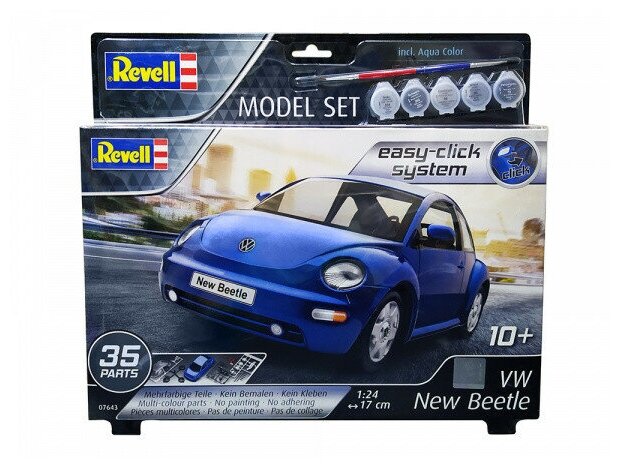 Revell Набор со сборной моделью автомобиля Фольксваген New Beetle от компании Revell. Машина представлена в масштабе 1 к 24. Модель выпускается по лицензии и в тесном сотрудничестве с Фольксваген, поэтому отличается аутентичностью. Модель собирается из 35 пластиковых элементов. Детали нужно склеить между собой, а потом покрасить согласно инструкции. В наборе есть декали для нанесения на модель номеров и другой символики. Особенности: Масштаб модели 1 к 24. Длина автомобиля составит 17 см. Модель рекомендуется для детей в возрасте от 10 лет. Внимание! В набор включены акриловые краски базовых цветов, клей и кисточка. Остальные инструменты и расходники придется докупить.