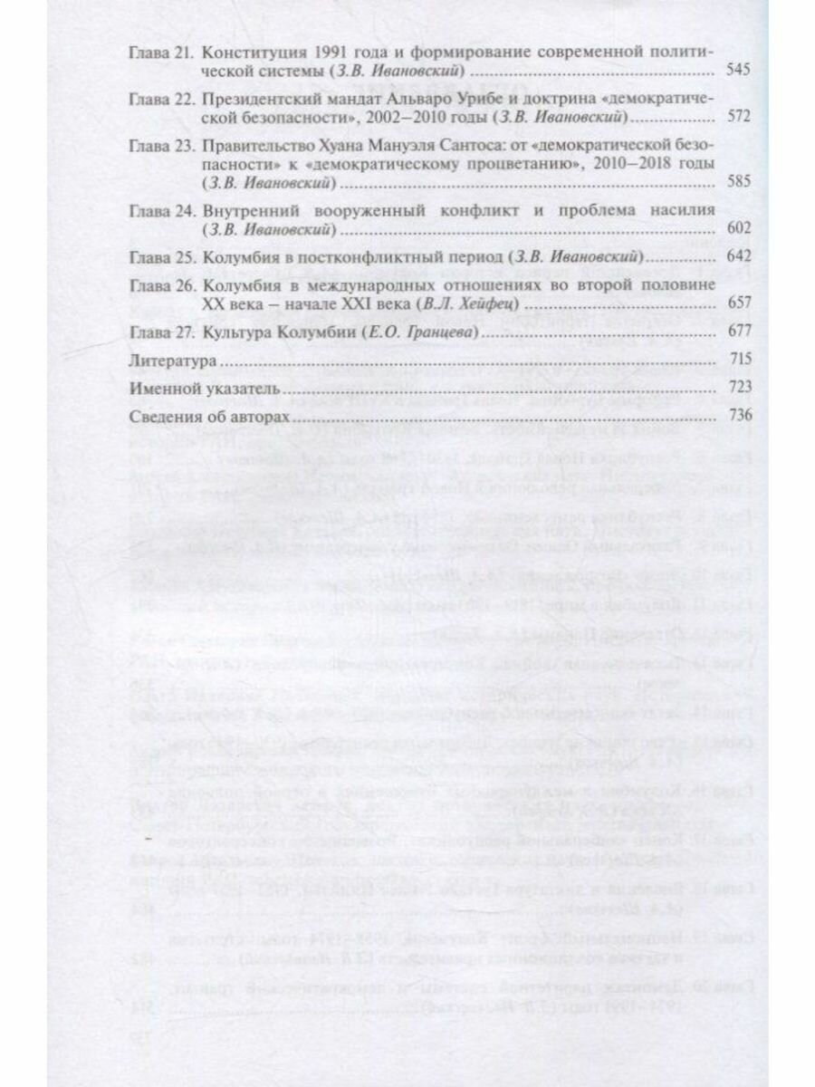 Книга охватывает более двух тысячелетий колумбийской истории: от древней цивилизации чибча-муисков до начала XXI века. Рассматриваются основные этапы развития колумбийской истории и культуры, войны за независимость, формирование традиционных, либеральной и консервативной партий, причины и ход внутригражданских конфликтов, эволюция идейно-политических течений, развитие рабочего и крестьянского движений, проблемы насилия в формировании колумбийской идентичности политической системы страны. Большое внимание уделено исторической биографии, жизни и борьбе известных политических деятелей, писателей и философов. Эти темы анализируются на основе широкого круга источников, часть которых впервые вводится в научный оборот. Книга богато иллюстрирована.