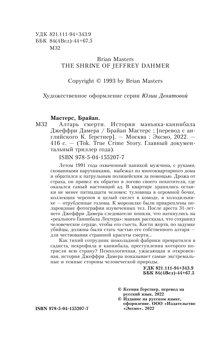 Алтарь смерти История маньяка-каннибала Джеффри Дамера (Брайан Мастерс); Эксмо, Inspiria, Редакция 1, 2022