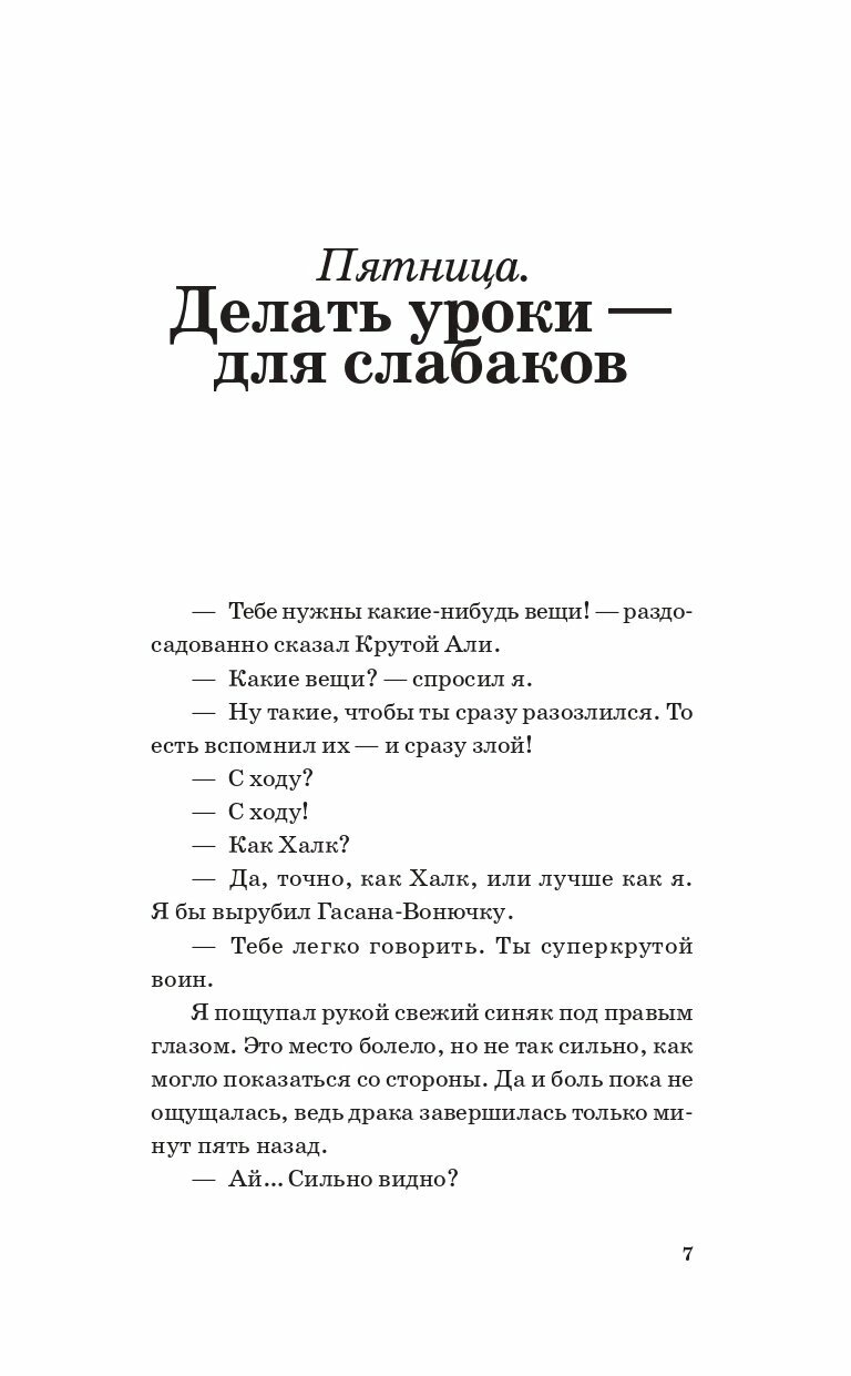 «На прошлой неделе это был главный урок, который мне преподал Крутой Али. Он называется "Техника боевого взгляда". Это когда ты идешь во дворе, на тренировках и в школе и смотришь всем в глаза, чуть-чуть опустив голову, как будто что-то скрываешь, и напрягаешь брови, как будто солнце светит в глаза. И потом ходишь так. А если есть капюшон, то его тоже накидываешь и смотришь на всех. Это очень важно, чтобы все понимали, что со мной нельзя шутить. Я иногда стараюсь его применять. Пока что перед зеркалом — и даже сам себя боюсь. Я очень крутой перед зеркалом».
