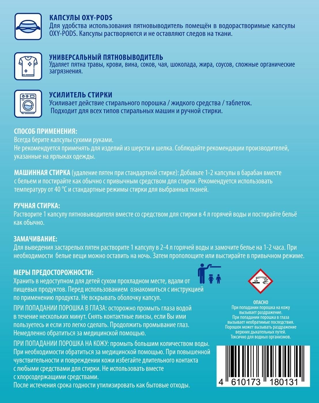 Универсальный пятновыводитель в капсулах - мощное чистящее средство на основе сильнодействующего кислорода, которое эффективно удаляет застарелые загрязнения и пятна, нейтрализует запахи, подходит для цветного белья. Для удобства использования пятновыводитель-отбеливатель помещен в водорастворимые капсулы OXY-PODS, каждая капсула рассчитана на 1 применение.