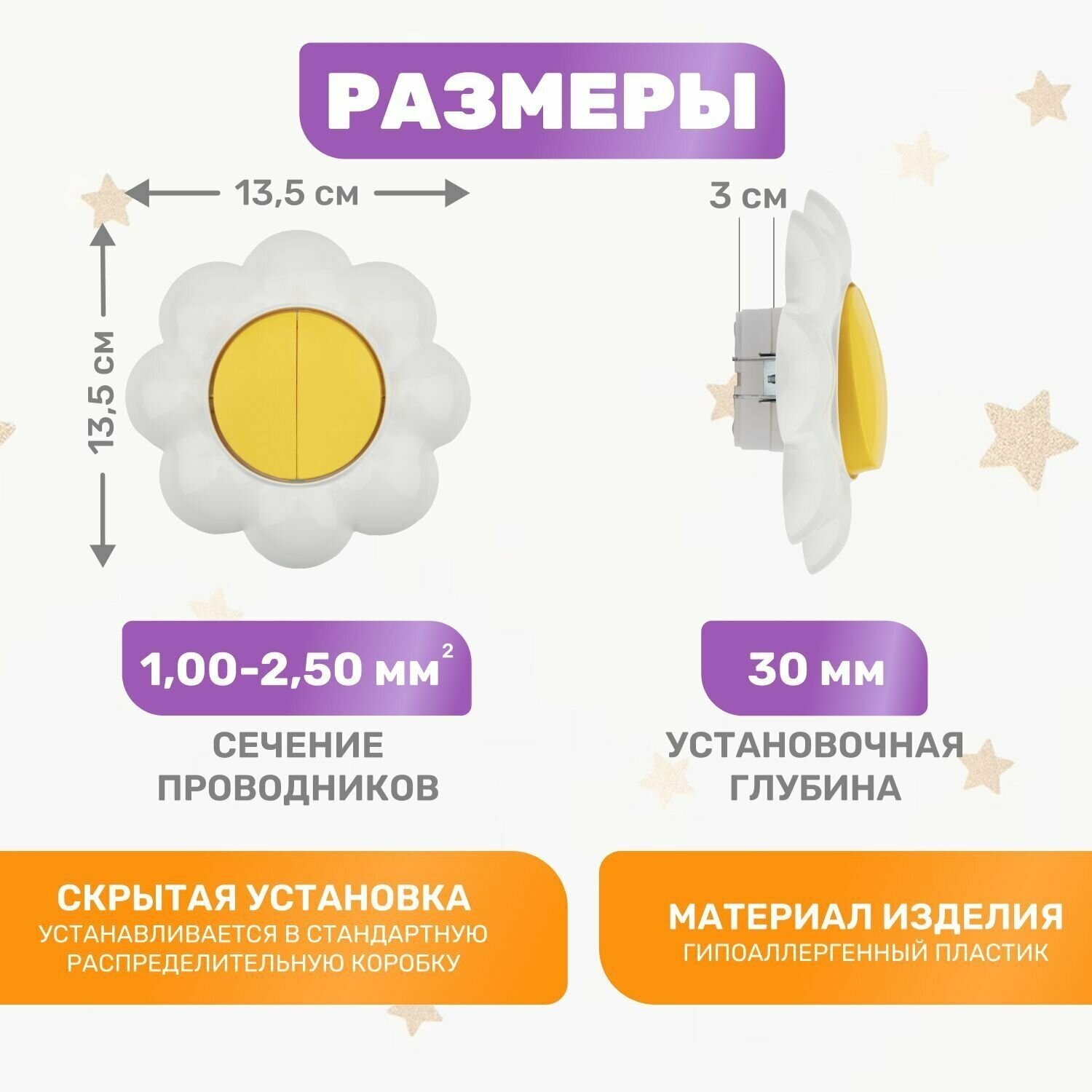 Двухклавишный выключатель является коммутационным устройством, рассчитанным на размыкание и замыкание электрической цепи. Выключатель применяется для включения и выключения освещения только в сухих помещениях, так как степень пылевлагозащиты IP 20. Используется в сетях до 250 В, на ток до 10 А. Изготовлен из качественного и термостойкого материала, окрашенного безвредными красками, который прослужит долгие годы, сохраняя первоначальный внешний вид даже при частом использовании, а яркий дизайн украсит любую детскую комнату и добавит ощущение радости и уюта. Благодаря надежному устройству изделия срок службы выключателя - 10 лет, а гарантийный срок – 24 месяца. Конструкция позволяет быстро и легко устанавливать выключатель методом скрытой установки.Размеры 135х135х45,5 мм.