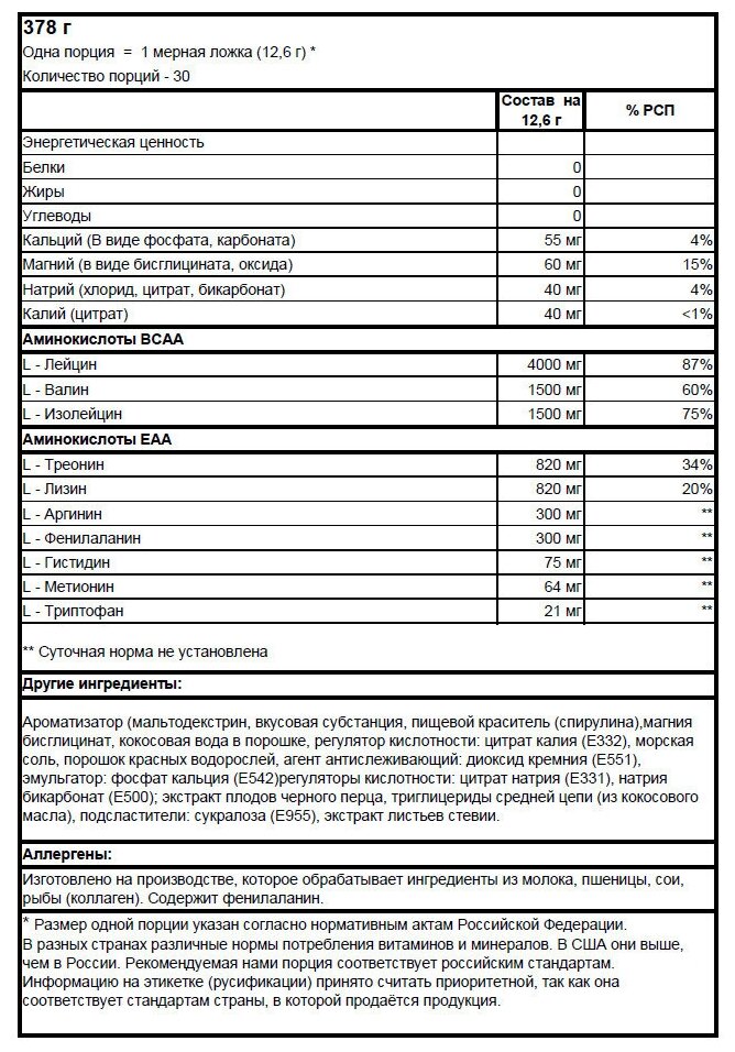 | Состав | L-лейцин, L-валин, L-изолейцин, регуляторы кислотности |