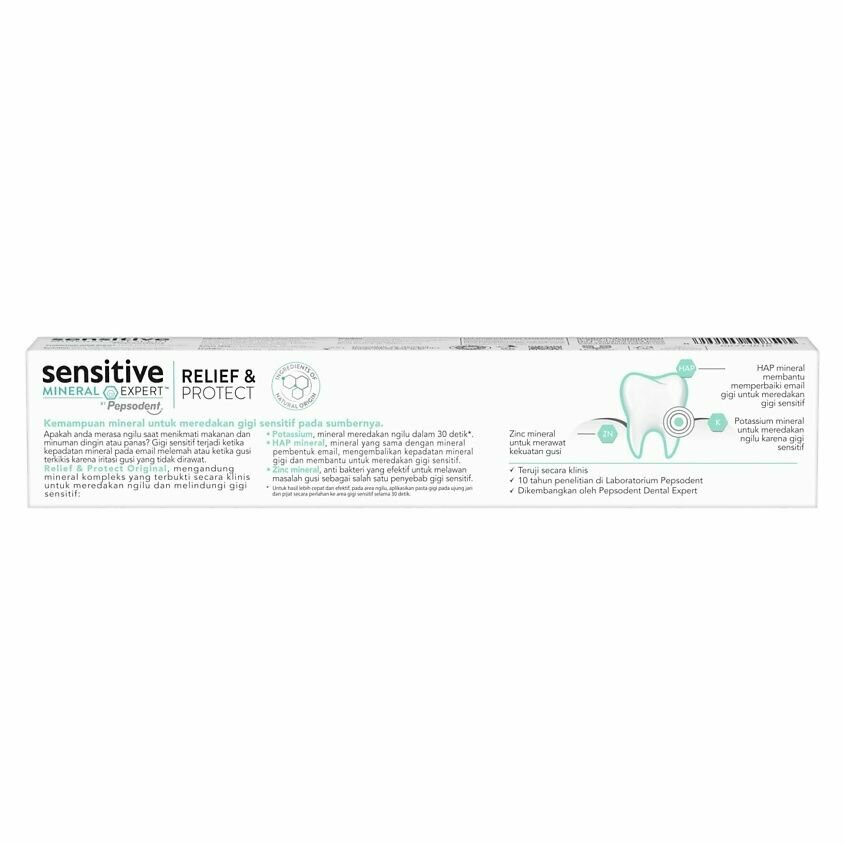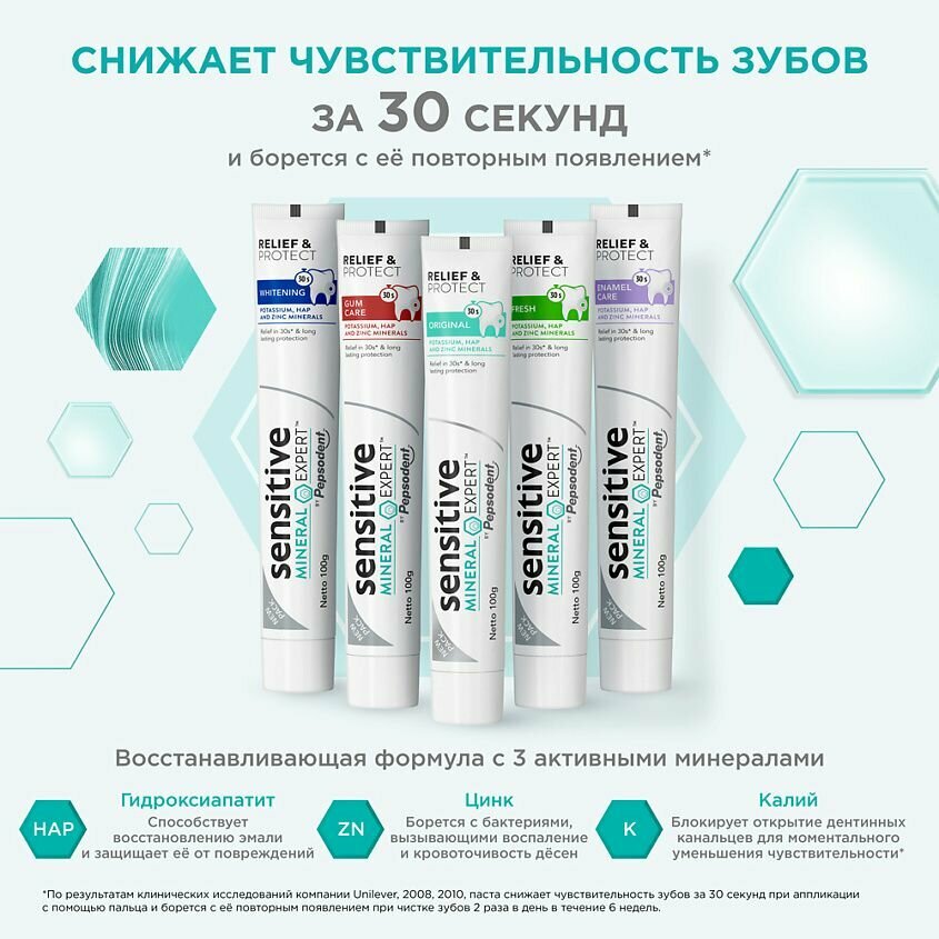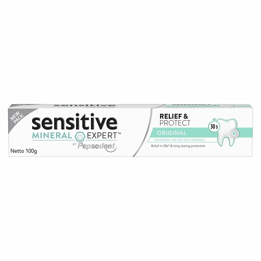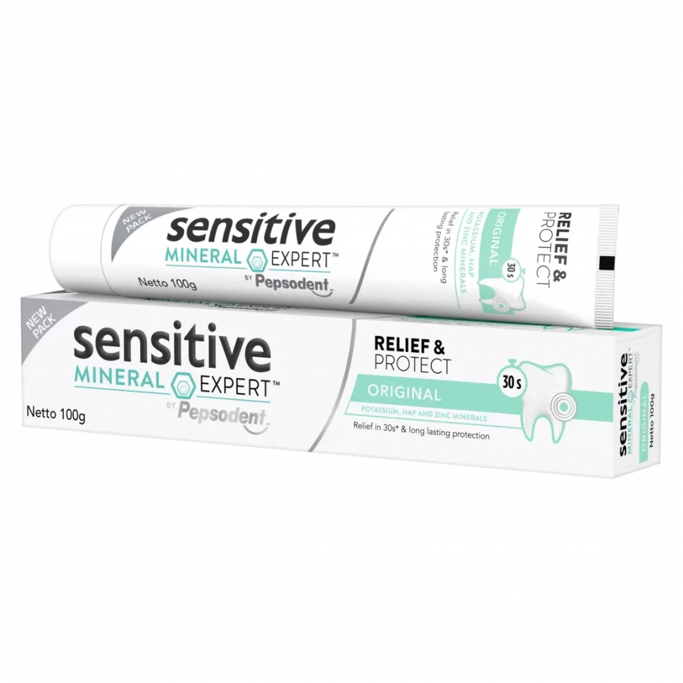Повышенная чувствительность зубов - это дискомфорт или болезненные ощущения в зубах после употребления холодных, горячих, сладких или кислых продуктов и напитков. Благодаря содержанию комплекса минералов, формула Sensitive Mineral Expert by Pepsodent снижает чувствительность зубов за 30 секунд и борется с ее повторным появлением. Соединение минералов калия обеспечивает снижение чувствительности за 30 секунд, гидроксиапатит за счет сходного состава с зубной эмалью восстанавливает минеральный состав костного