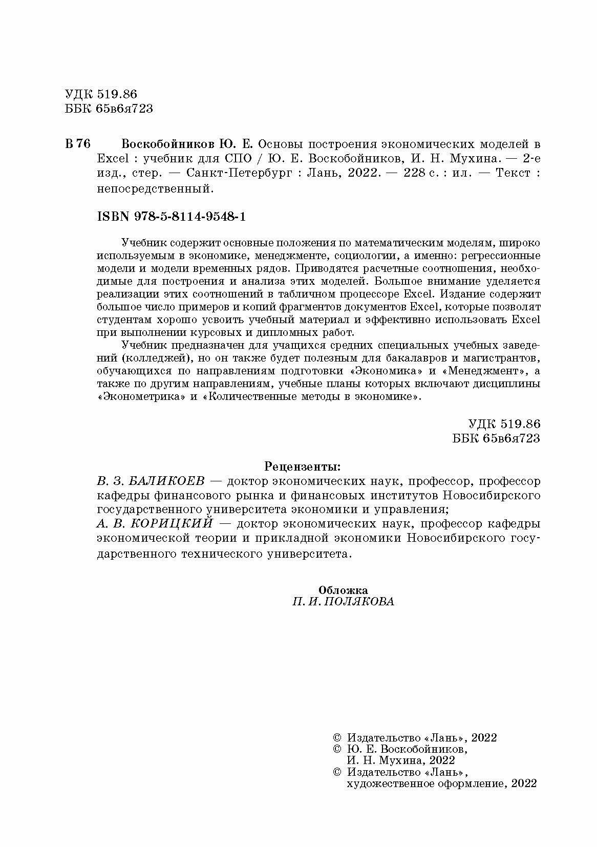Основы построения экономических моделей в Excel (Воскобойников Юрий Евгеньевич, Мухина Ирина Николаевна); Лань, 2022