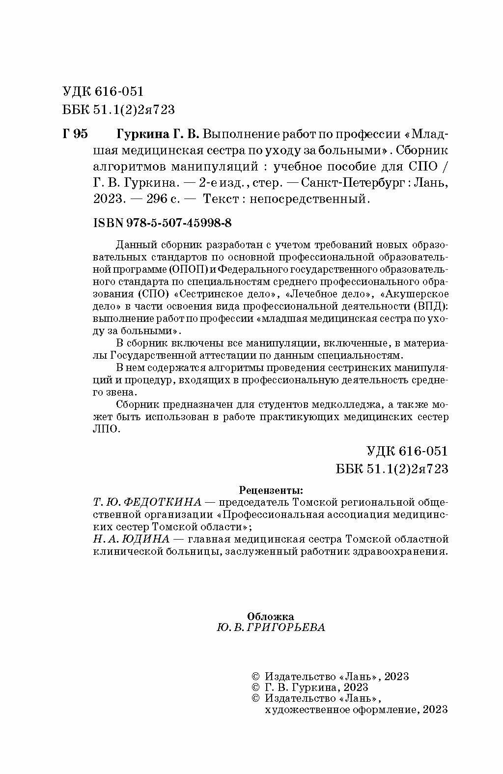 Выполнение работ по профессии «Младшая медицинская сестра по уходу за больными». Сборник алгоритмов (Галина Васильевна Гуркина); Лань, 2023