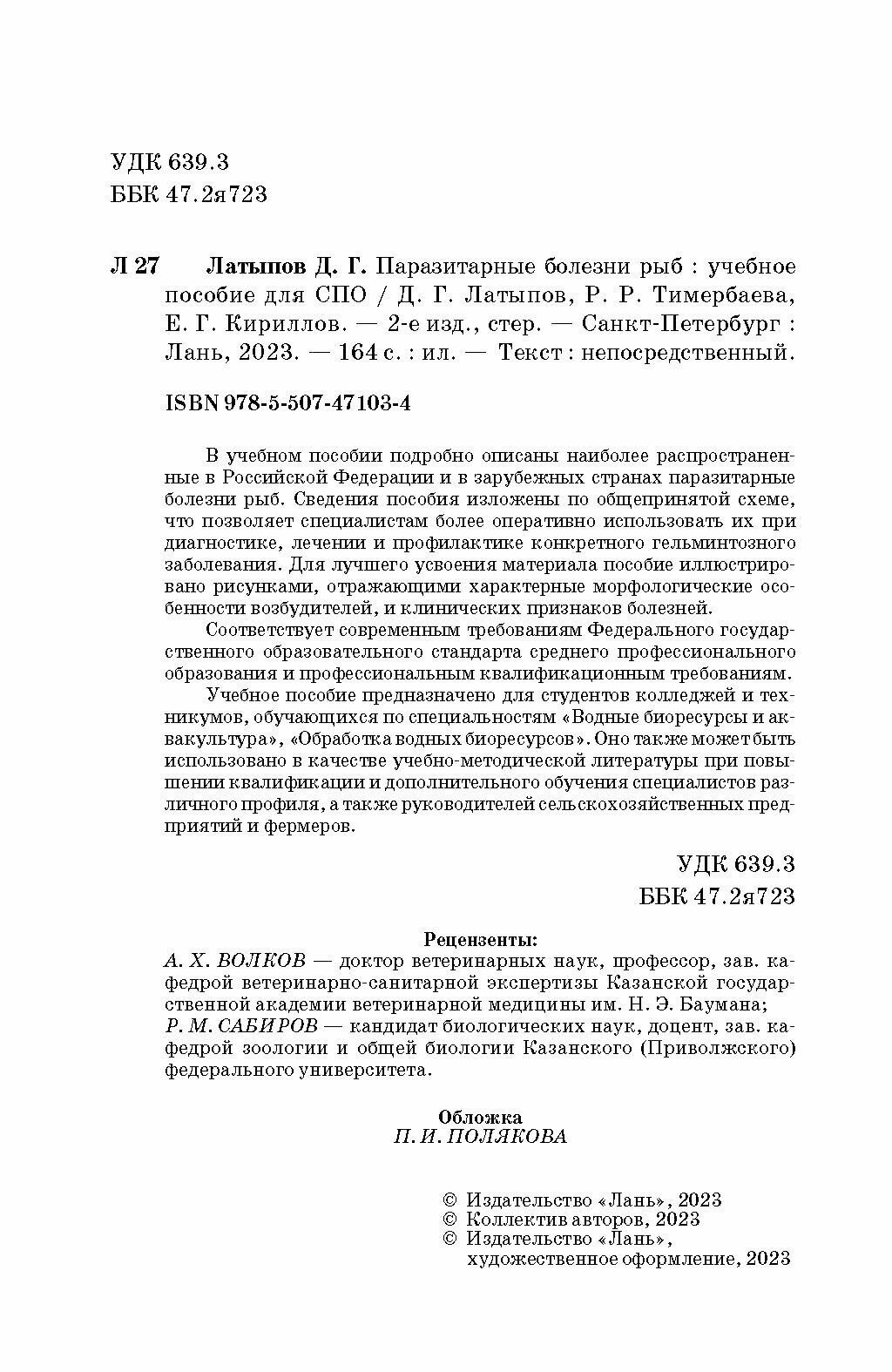 Паразитарные болезни рыб.СПО (Латыпов Далис Гарипович, Тимербаева Разалия Рустамовна, Кириллов Евгений Геннадьевич); Лань, 2023