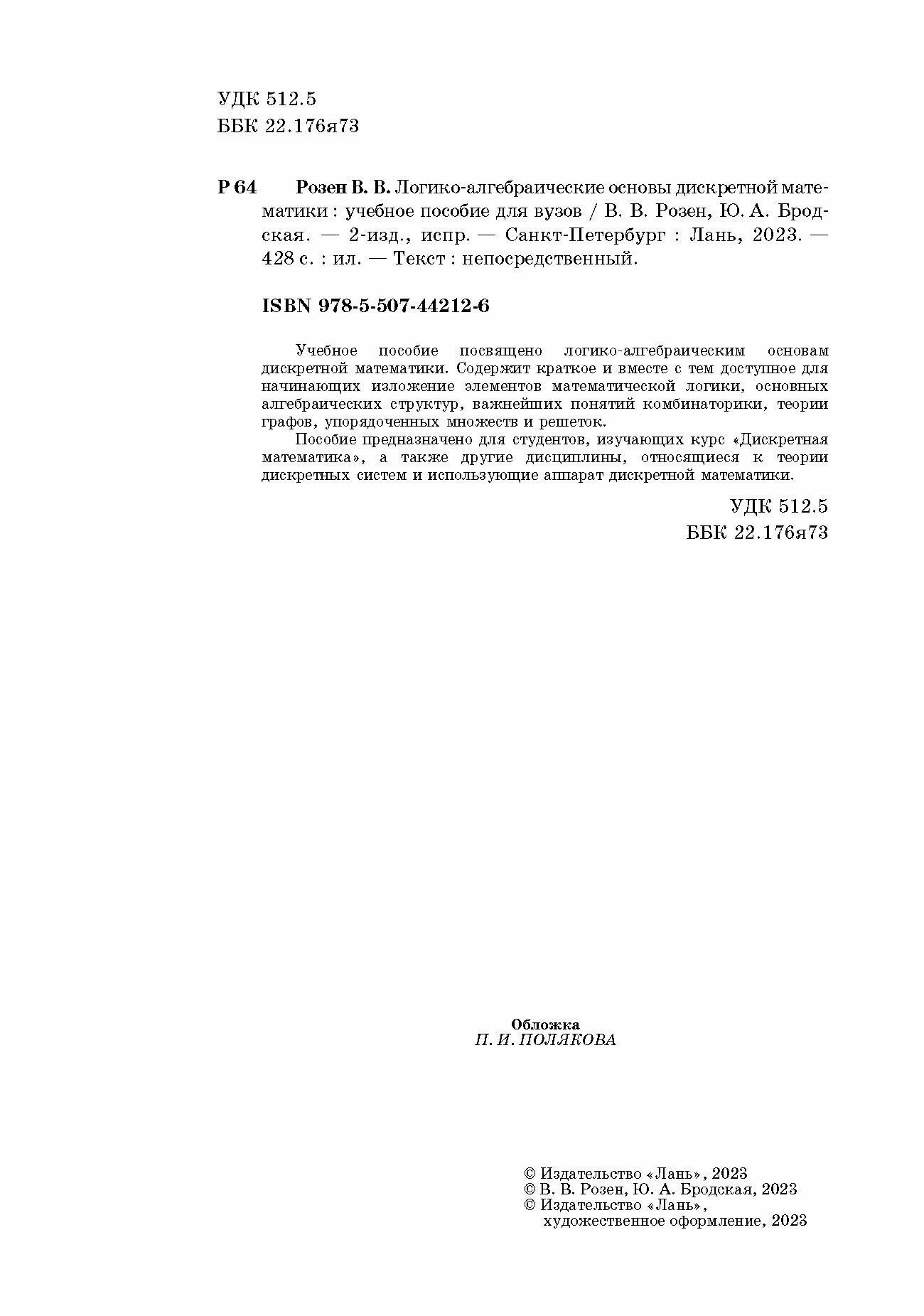 Логико-алгебраические основы дискретной математики (Розен Виктор Владимирович, Бродская Юлия Анатольевна); Лань, 2022