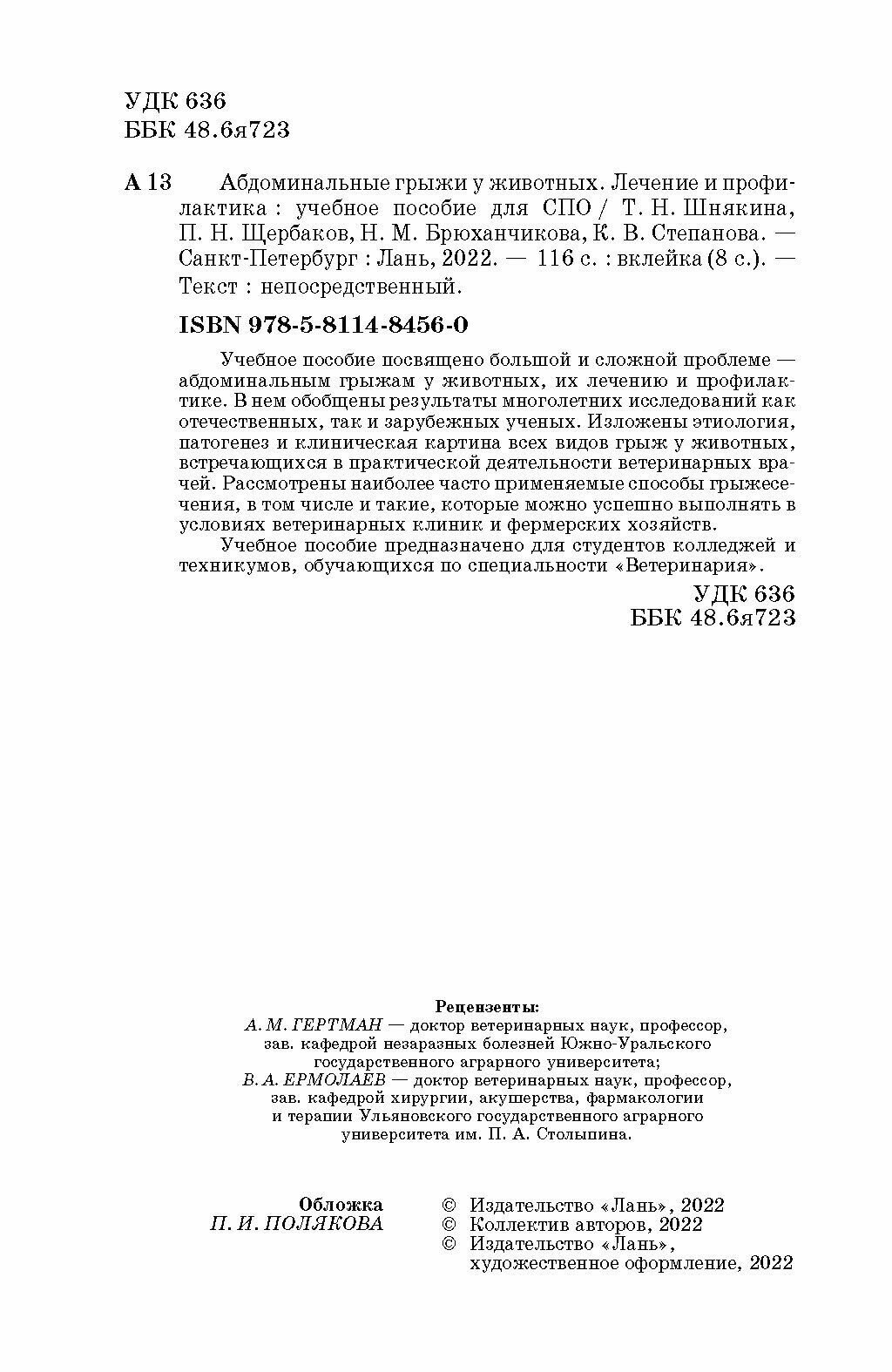 Абдоминальные грыжи у животных. Лечение и профилактика (Шнякина Таьяна Николаевна, Щербаков Павел Николаевич); Лань, 2022