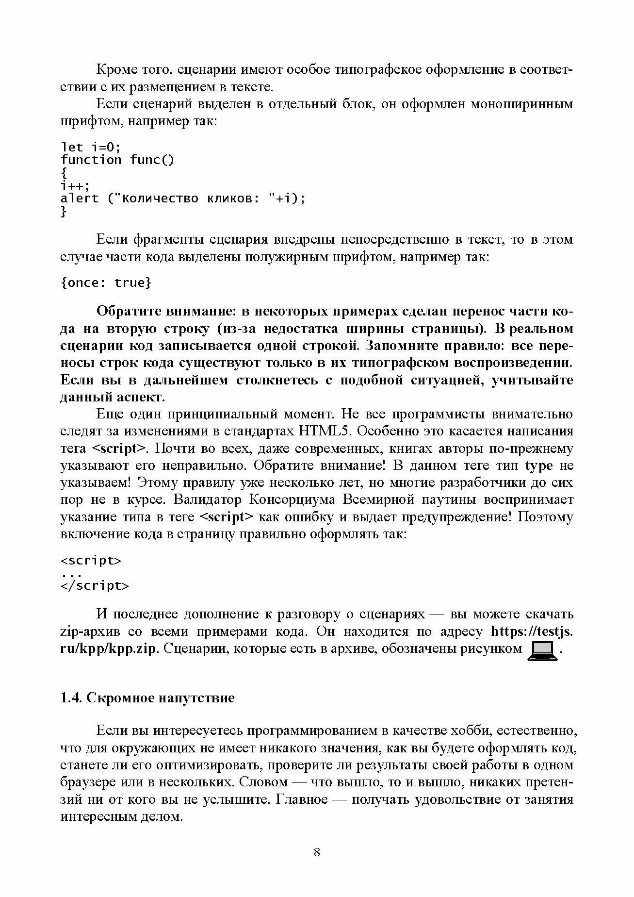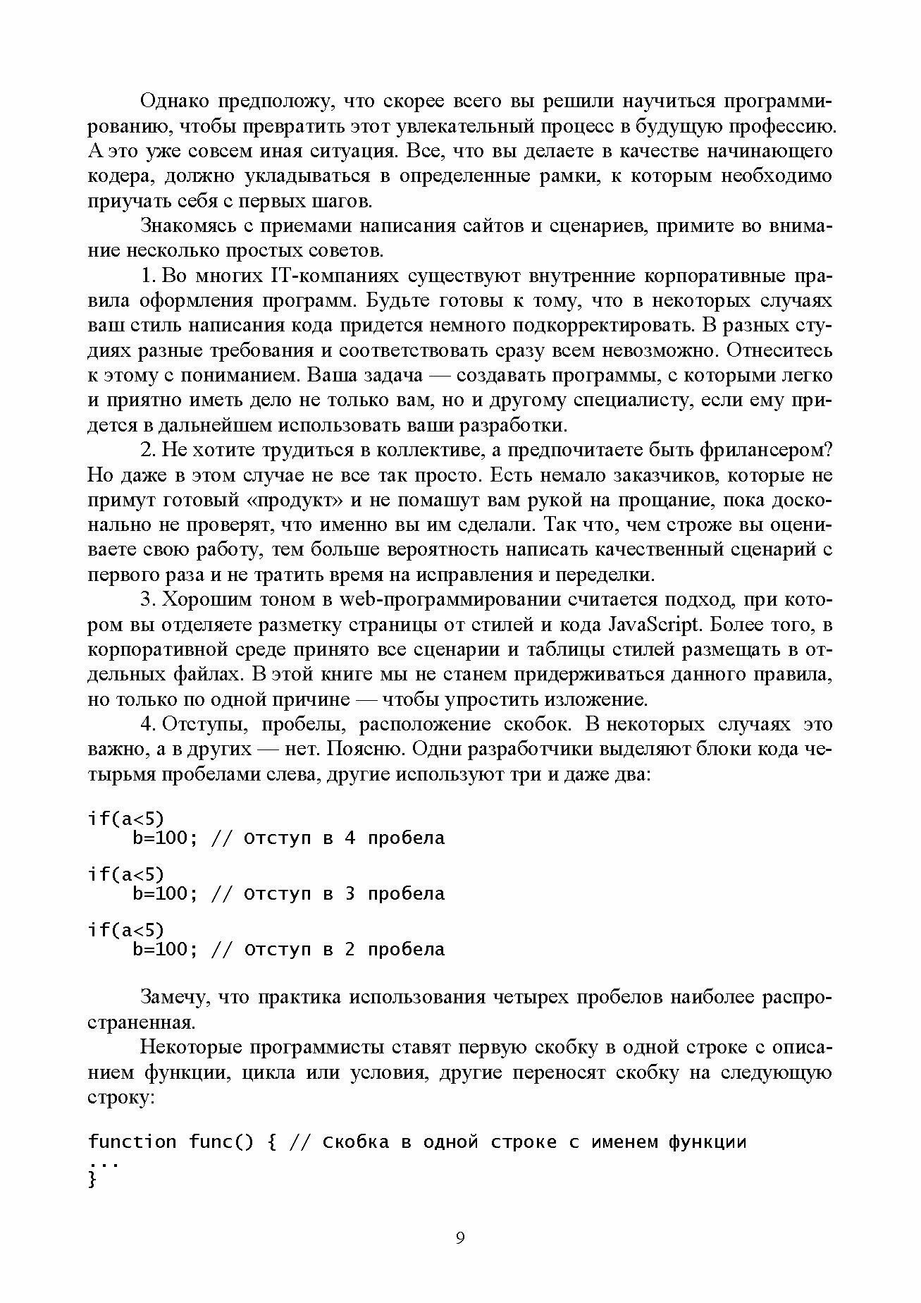 В книге рассматриваются все этапы написания сценариев на JavaScript: от появления идеи до финальных испытаний. Читатели узнают, как про-исходят: подготовка среды разработки на персональном компьютере; фор-мирование алгоритма выполнения проекта; освоение приемов написания качественных сценариев; работа с переменными, массивами, операторами, регулярными выражениями, функциями; тестирование, отладка и стан-дартизация кода. Особое внимание уделено методам, приемам и навыкам, которые помогут разработчику упростить создание интернет-проектов. Кроме того, подробно разобраны примеры нескольких готовых сценариев.