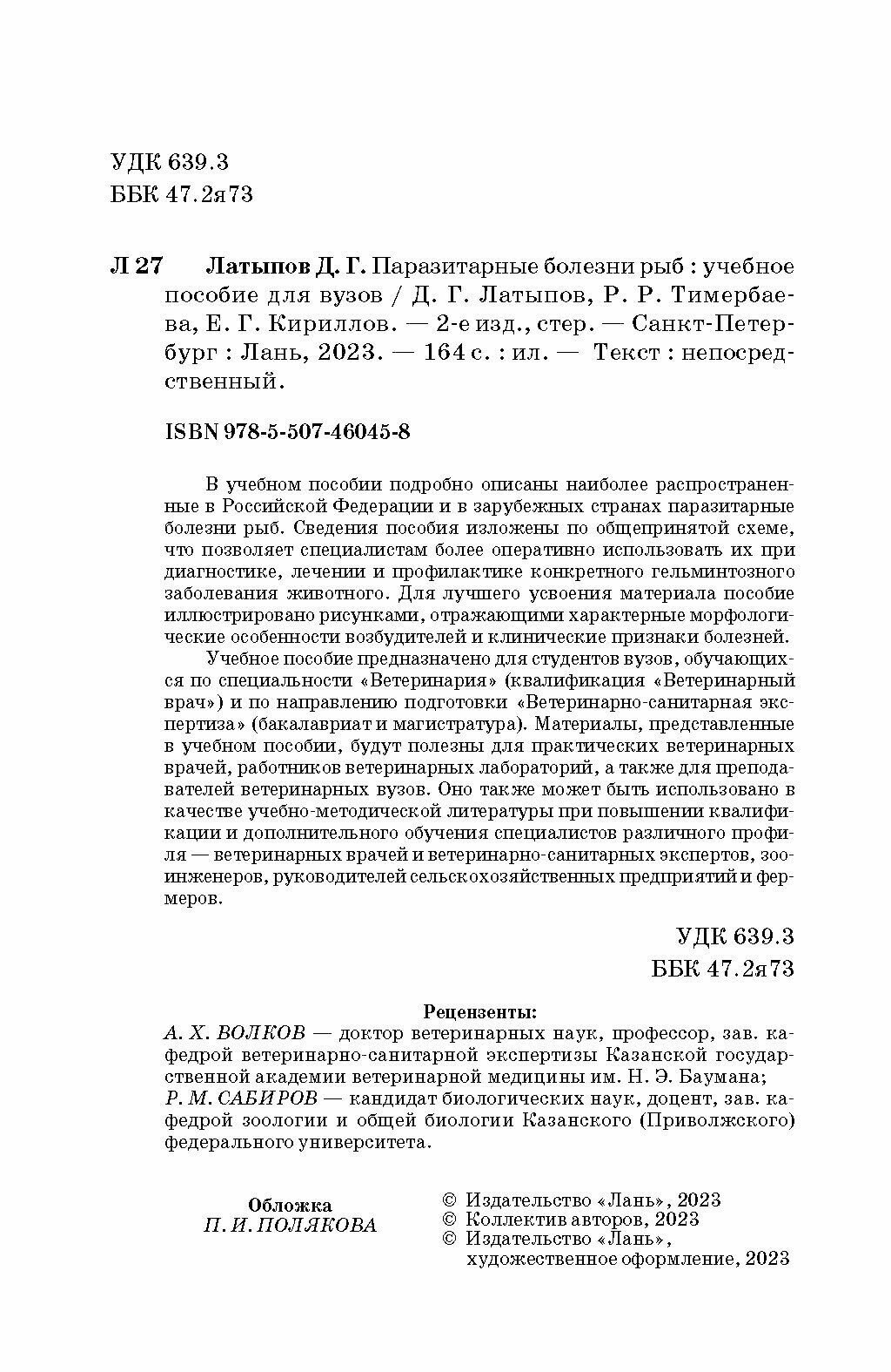Паразитарные болезни рыб.Уч.пос (Латыпов Далис Гарипович, Тимербаева Разалия Рустамовна, Кириллов Евгений Геннадьевич); Лань, 2022