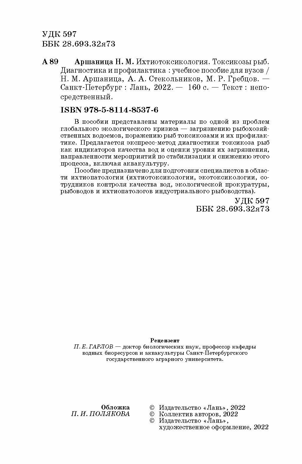 Ихтиотоксикология.Токсикозы рыб.Диагност.и профил. (Аршаница Николай Михайлович, Стекольников Александр Анатольевич, Гребцов Михаил Робертович); Лань, 2022