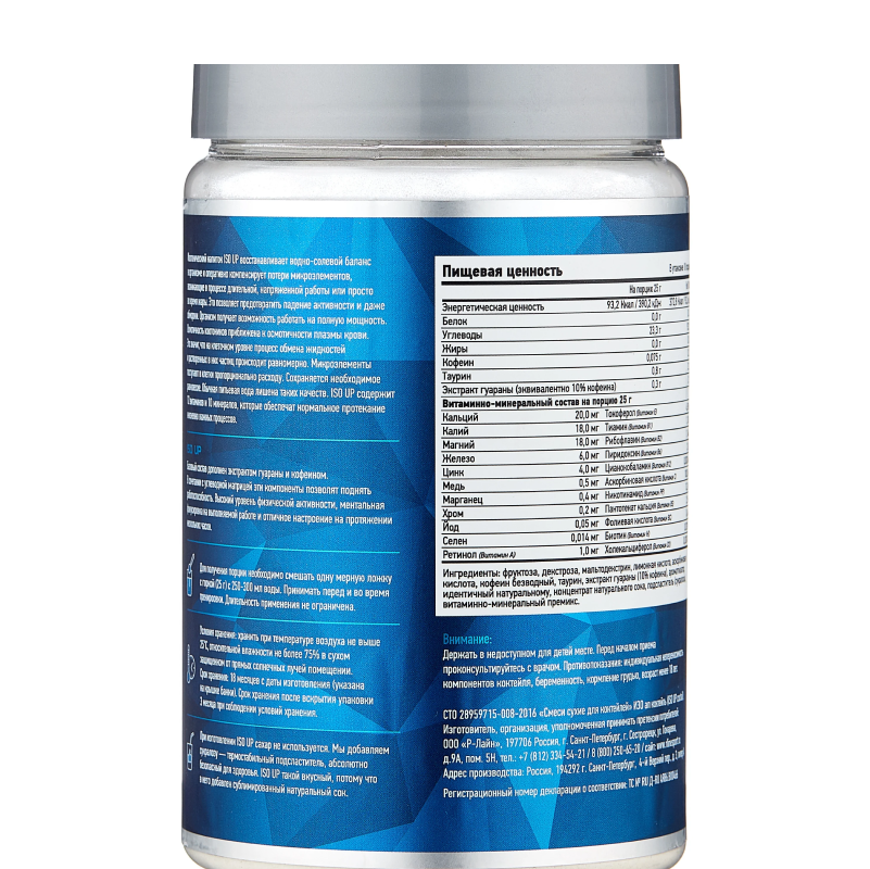 | Состав | фруктоза, декстроза, мальтодекстрин, лимонная кислота, аскорбиновая кислота, кофеин безводный, таурин, экстракт гуараны (10% кофеина), витаминно-минеральный премикс, концентрат натурального сока, подсластитель (сукралоза); ароматизатор, идентичный натуральному |