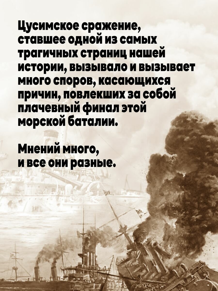 Цусимское сражение, ставшее одной из самых трагичных страниц нашей истории, вызывало и вызывает много споров, касающихся причин, повлекших за собой плачевный финал этой морской баталии. Мнений много, и все они разные.