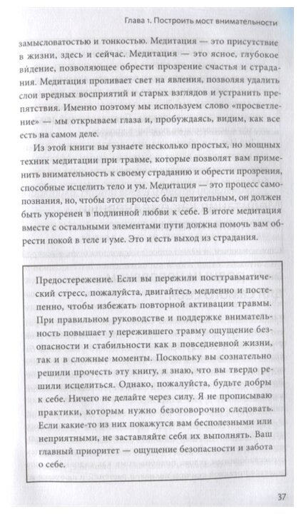 Книга о том, как пережить последствия травмирующего события с помощью практики mindfulness. В этой понятной и мудрой книге буддийская монахиня и бывший врач Данг Нгием описывает подход к исцелению от травмы с помощью практики mindfulness. Нгием обучает читателей медитации, дыхательным техникам и аффирмациям любви к себе, которые помогают устранить эмоциональные и физические последствия травматических переживаний. Помимо практик Нгием приводит научные данные, полученные ею в ходе обучения на врача, и личные истории. Эти небольшие рассказы усиливают эмоциональное воздействие книги, особенно когда Нгием делится собственным опытом: она пережила насилие. Книга подойдет не только тем, кто пережил травму: она будет полезна любому, кто ищет возможности для роста и самопознания.
