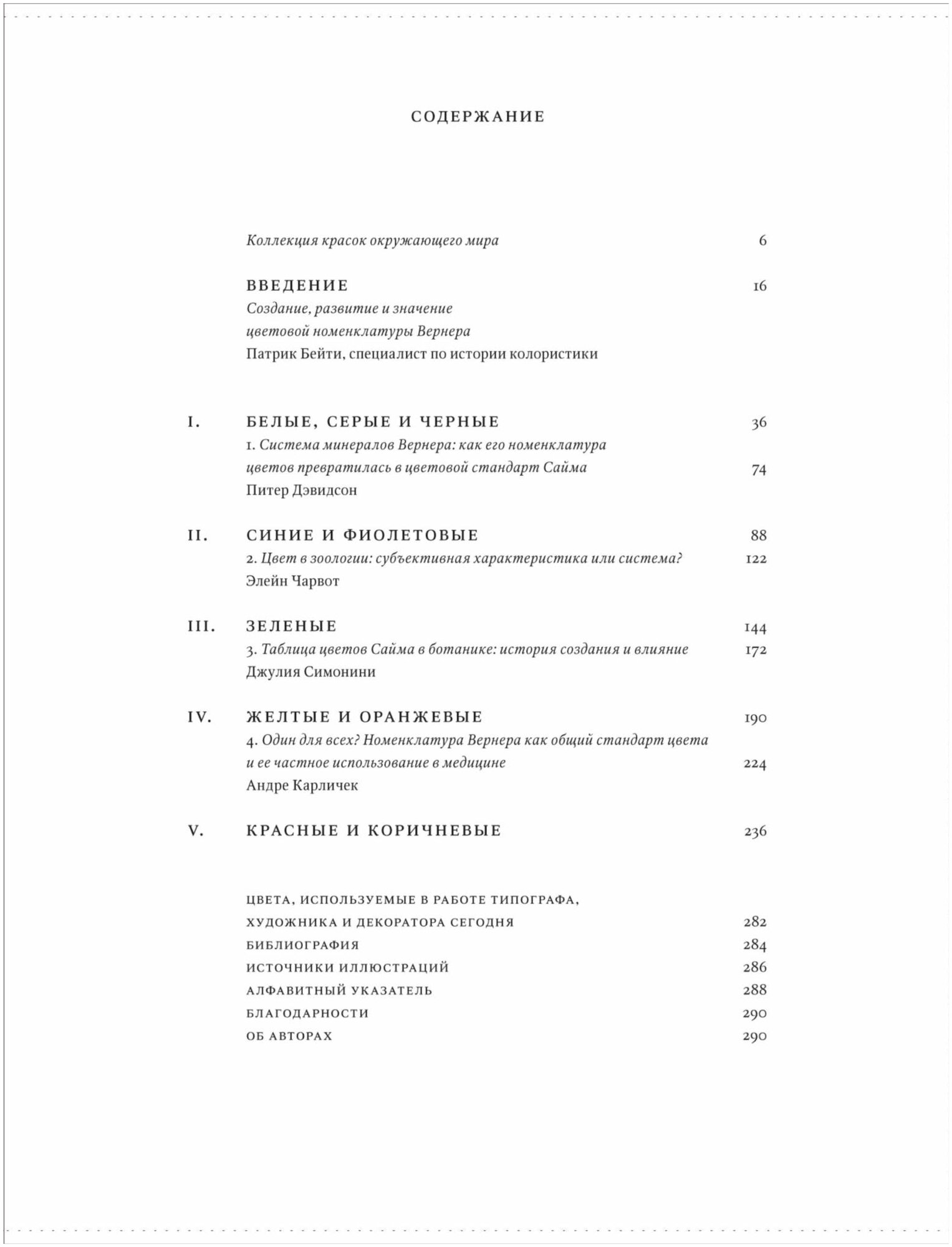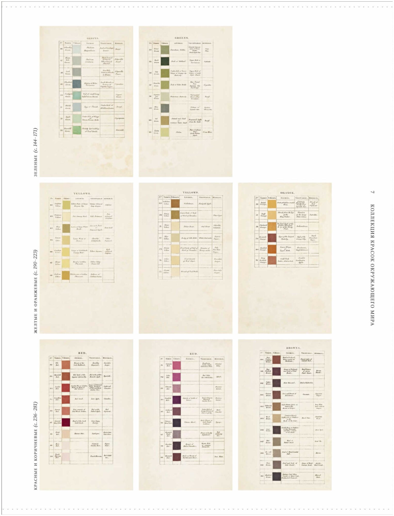 В 1774 году немецкий геолог Абраам Готлоб Вернер разработал систему классификации минералов, позволяющую идентифицировать и описывать их, основываясь на внешних признаках. Он полагал, что цвет - одна из ключевых характеристик для идентификации минералов, поэтому разработал специальную номенклатуру из 54 цветов и для наглядности каждому привел в соответствие минералы из своей коллекции. В течение последующих 40 лет Вернер возвращался к своему классификатору и расширял его, периодически делясь с учениками обновленными списками, которые те использовали и дополняли в собственных работах. В 1814 году шотландский художник Патрик Сайм расширил номенклатуру Вернера до 108 цветов, а чуть позже, в 1821-м, - до 110. Он добавил к ссылкам Вернера на минералы ссылки на виды животных и растений, а также снабдил каждый из упомянутых цветов образцом с соответствующей заливкой.