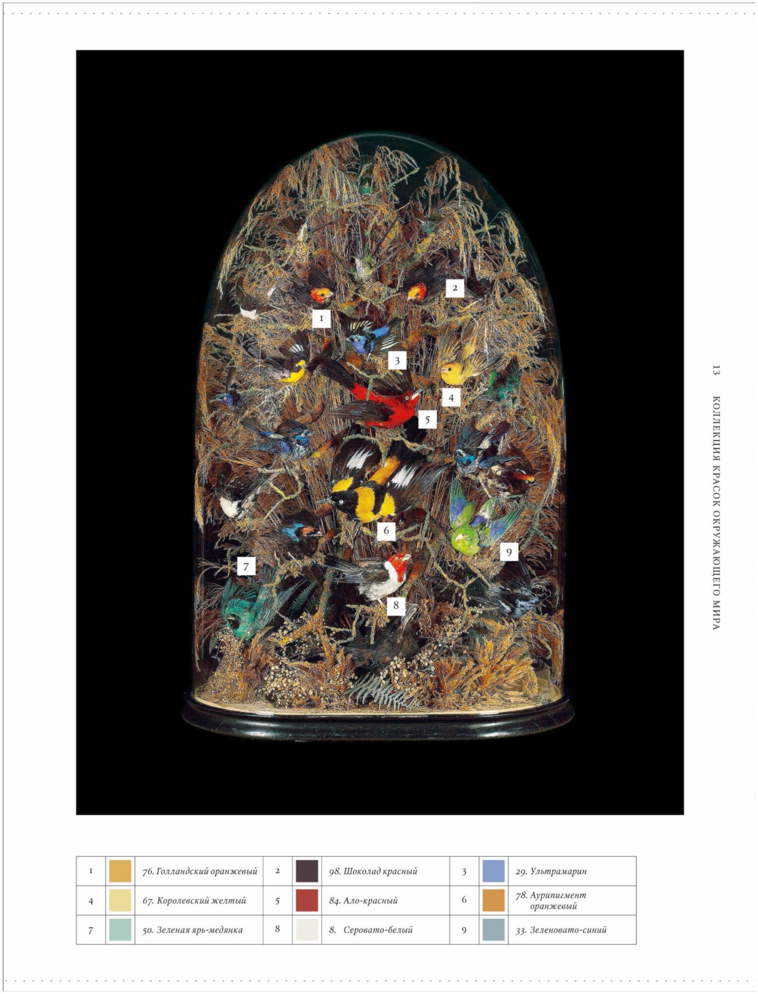 "Цвет в природе" делает это замечательное издание доступным для сегодняшних читателей. Каждый цвет, на который ссылались Вернер и Сайм, проиллюстрирован примерами из мира животных, растений и минералов. Иллюстрации взяты из коллекций натуралистов XVIII-XIX веков. Читатели могут разглядеть черепичный красный на грудке снегиря, фарфоровидной яшме или лепестках очного цвета, полюбоваться берлинским синим в оперении сойки, на сапфире или лепестках печеночницы.