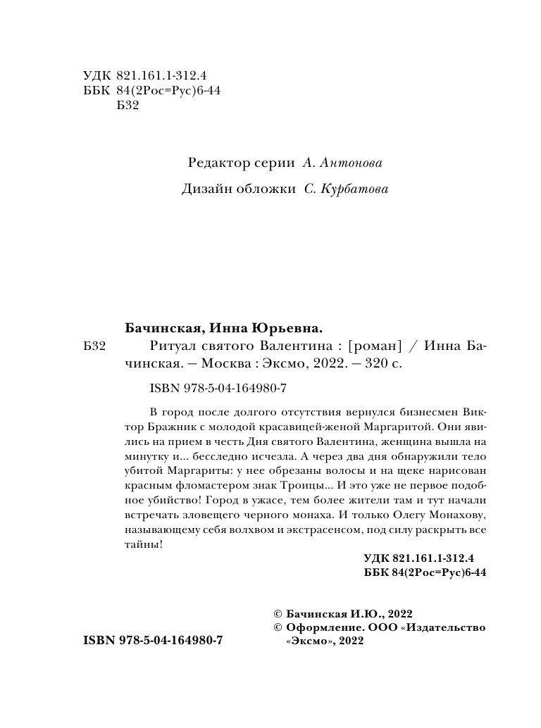 Книга: Ритуал святого Валентина (Бачинская Инна Юрьевна); ООО "Издательство "Эксмо", 2022