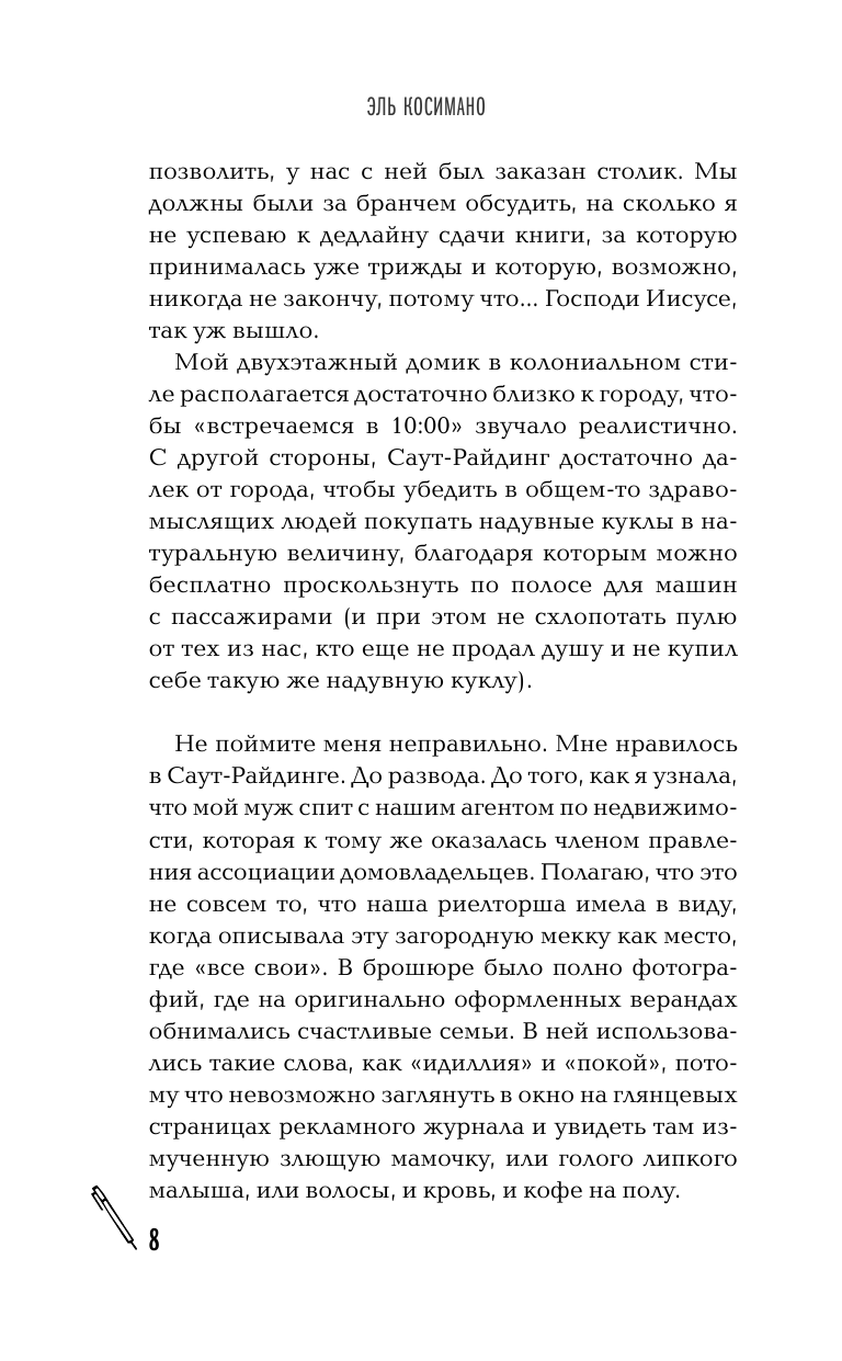 Общеизвестно, что большинство мам, какой день ни возьми, к восьми тридцати утра готовы кого-нибудь убить. В тот конкретный день, вторник восьмого октября, я была готова к семи сорока пяти. Представьте, вы запихиваете в подгузник двухгодовалое дитя, обмазавшееся кленовым сиропом, в то время как четырехгодовалое решило сделать себе стрижку (как раз когда надо выдвигаться в садик)
