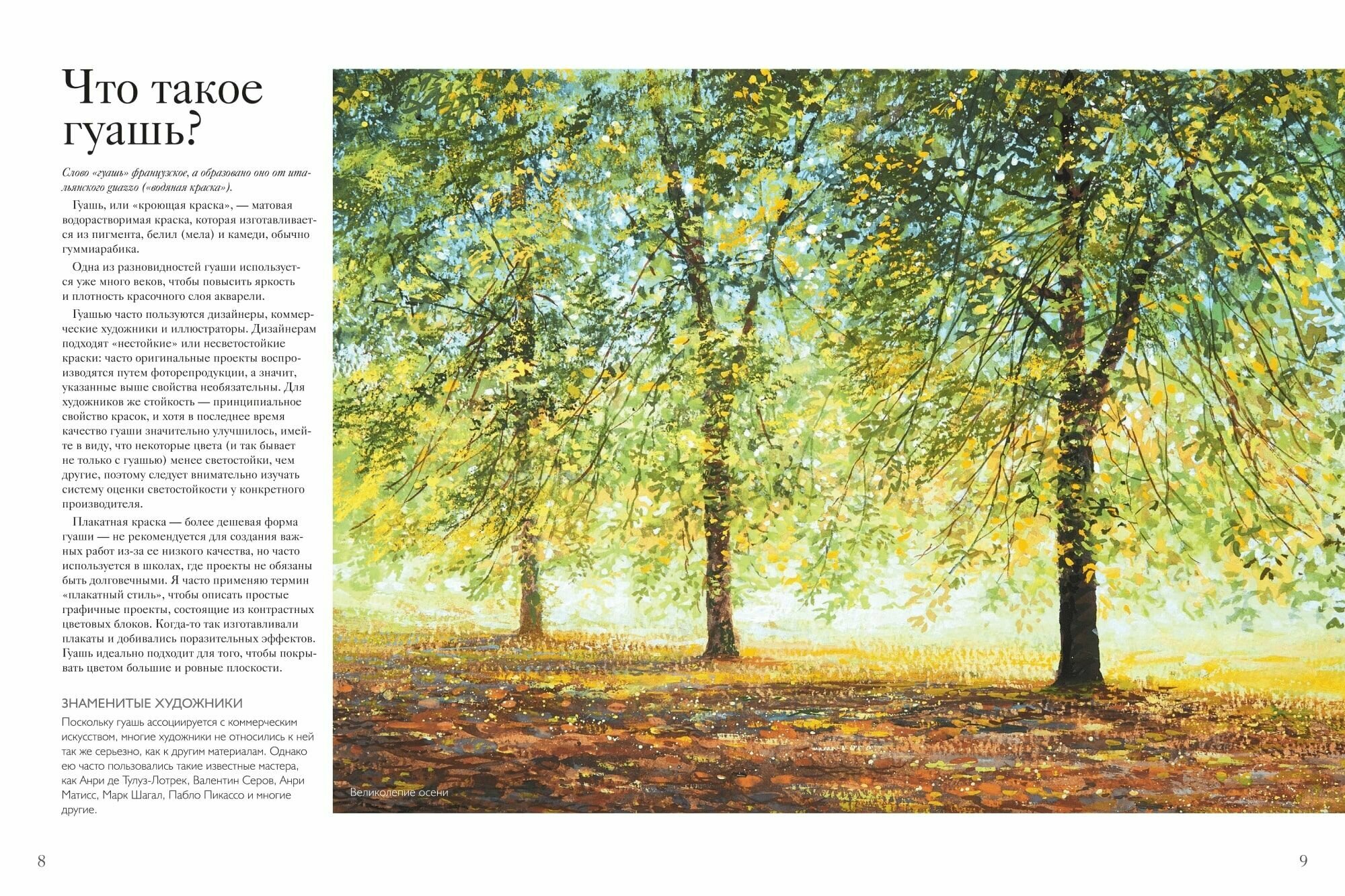 Чудесная книга по живописи гуашью, формата чуть меньше А4, очень хорошо изданная, с полезным содержанием для любителей рисования. Качество иллюстраций отличное. Единственный минус - пояснения к иллюстрациям набраны очень мелким шрифтом (кажется, этим постоянно грешит МИФ). Все остальное - на высоте.