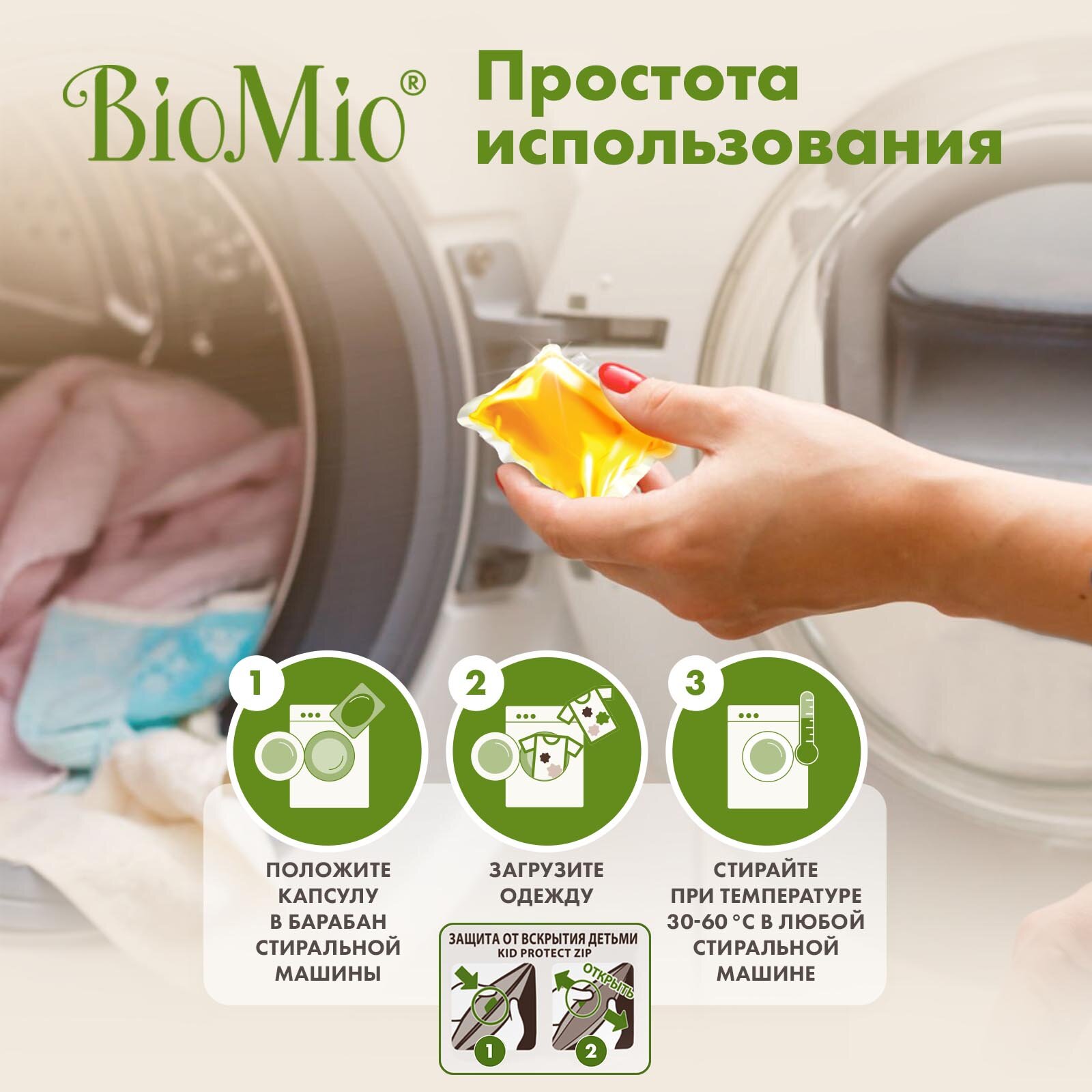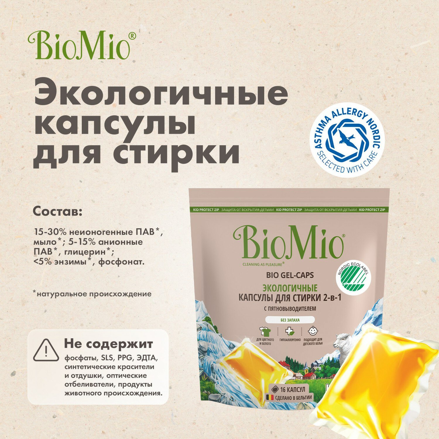 Инновационные экологичные капсулы для стирки BioMio BIO GEL-CAPS - это самое удобное концентрированное средство для стирки, которое позволит стирать вещи в стиральной машинке без лишних хлопот и с удовольствием. Капсулы 2-в-1 с пятновыводителем позволяют эффективно отстирывать загрязнения как на цветных, так и на белых тканях при разных температурных режимах. Безопасная гипоаллергенная формула подойдет для стирки детских вещей и для тех, у кого чувствительная кожа. Упаковки капсул хватит на 16 стирок.