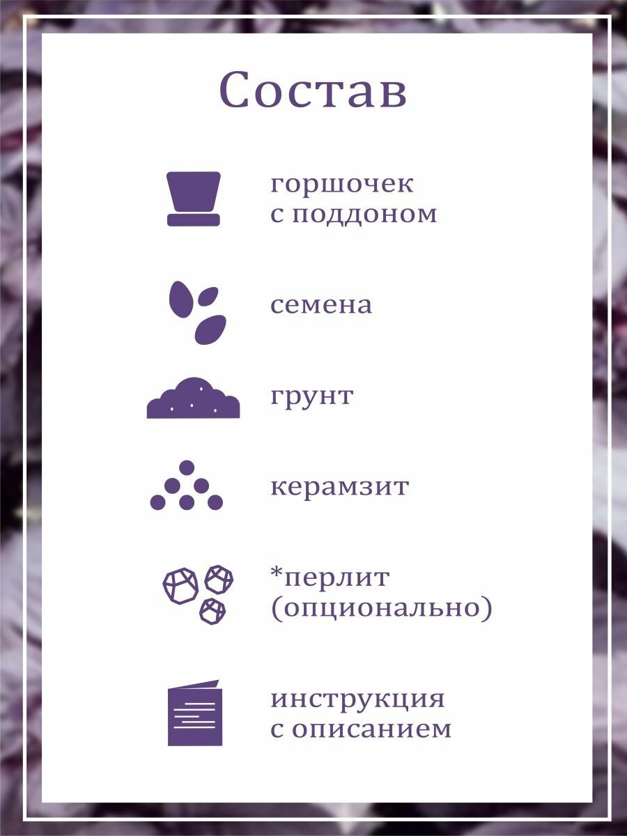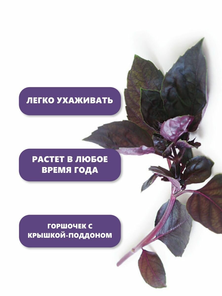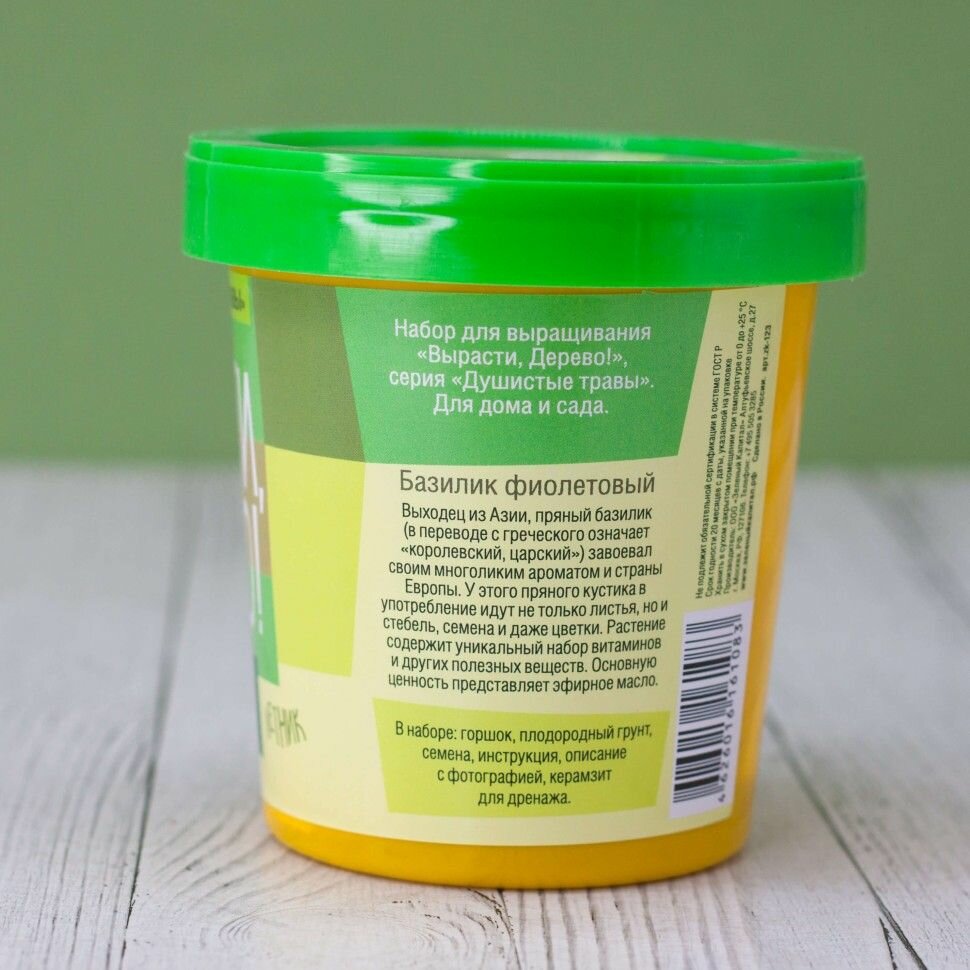 | Комплектация | пластиковый горшок, крышка-поддон для избытка влаги, семена базилика фиолетового, плодородный грунт (PH=5,5-6,5), керамзит для дренажа |