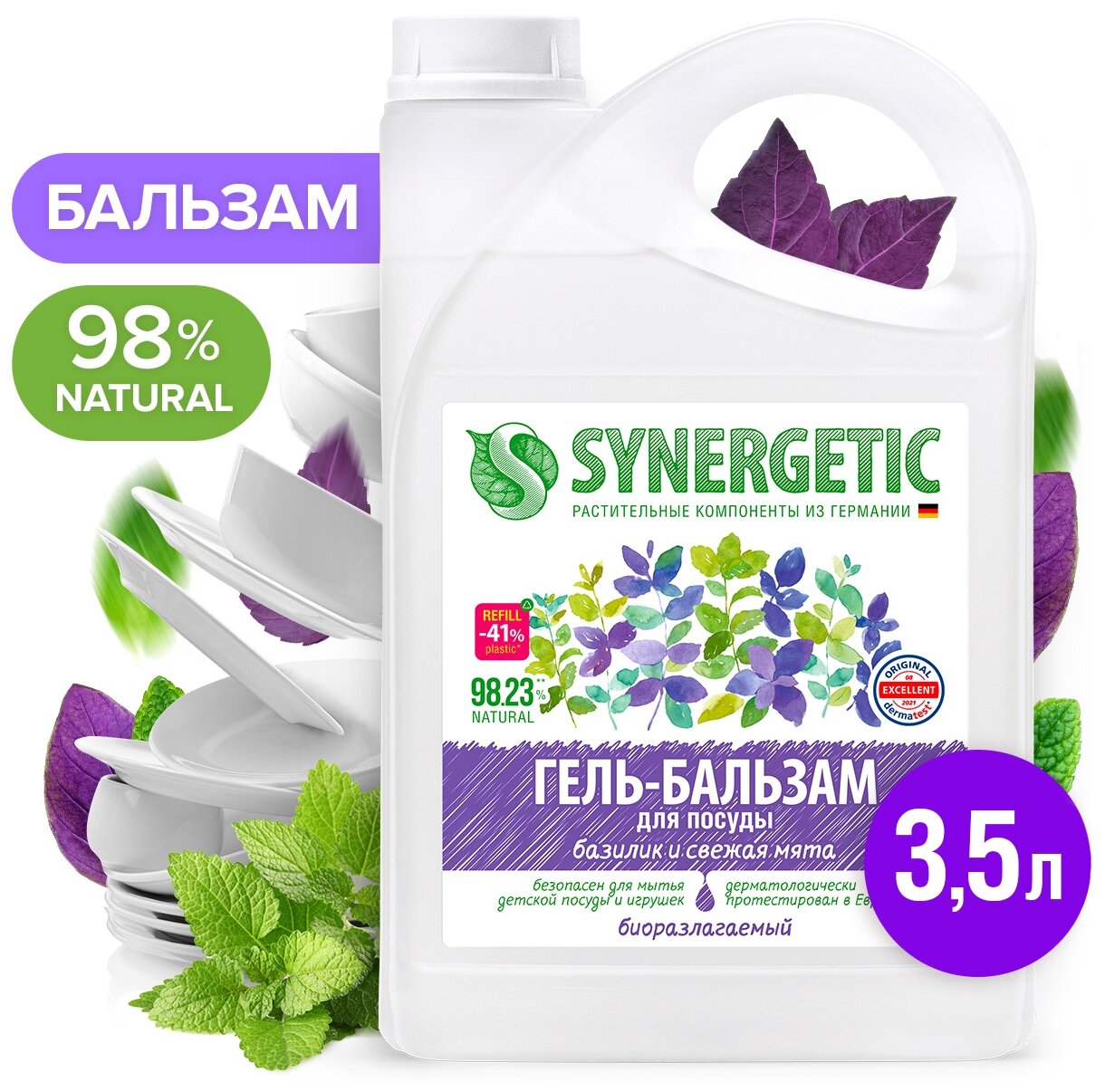 Биоразлагаемый гель-бальзам для посуды SYNERGETIC «Базилик и свежая мята» предназначен для мытья всех видов посуды (в том числе детской), кухонного инвентаря и детских игрушек.