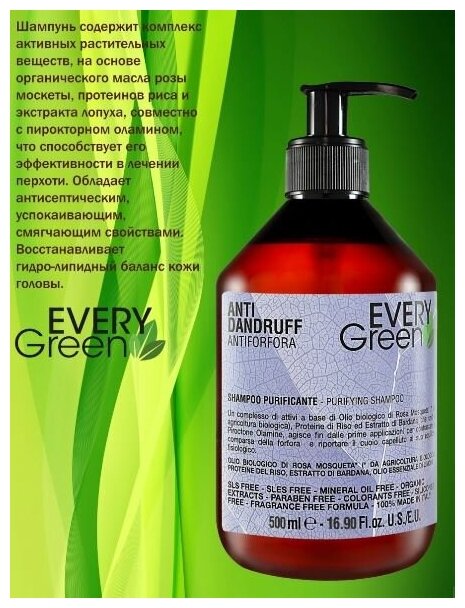 Шампунь содержит комплекс активных растительных веществ, на основе органического масла розы москеты, протеинов риса и экстракта лопуха, совместно с пирокторном оламином, что способствует его эффективности в устранении перхоти. Обладает антисептическим, успокаивающим, смягчающим кожу головы свойствами. Восстанавливает гидро-липидный баланс кожи головы. Компоненты шампуня подобраны таким образом, что эффективно устраняют проблему перхоти, при этом не вызывая побочных негативных явлений. Не вызывает привыкания. После восстановления кожи головы рекомендовано использовать шампунь в качестве профилактики 1 раз в месяц.