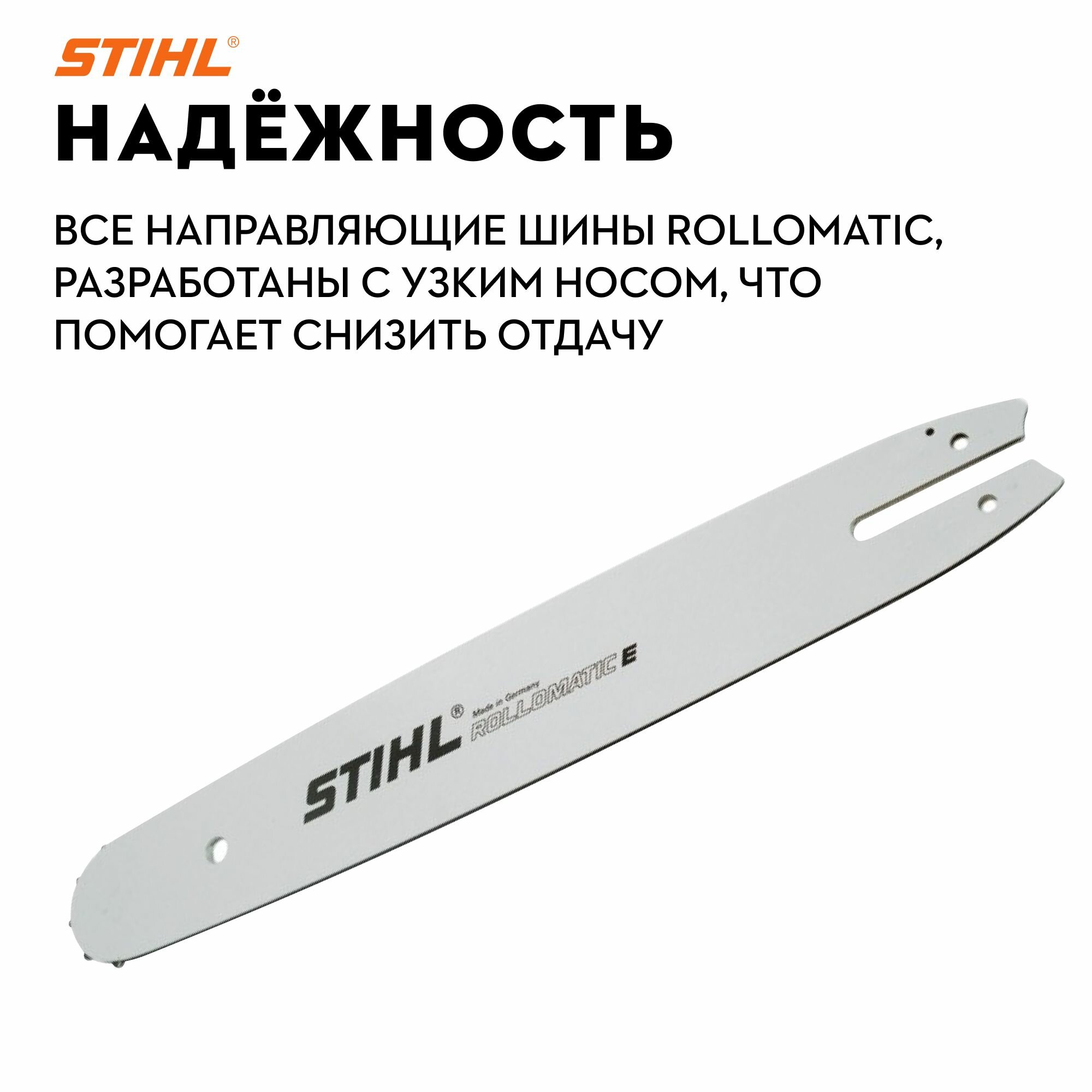 Шина STIHL Rollomatic E Lightсостоит из двух стальных пластин с вырезами большой площади, соединенных электросваркой. Свободные полости в шине заполнены полиамидом, армированным стекловолокном. Результат: уменьшение веса на 38%. Очень слабая отдача. Идеально для ухода за деревьями. Возможность замены направляющей звёздочки.Преимущества Специальное покрытие, защищающее от коррозии Прочность Малый вес
