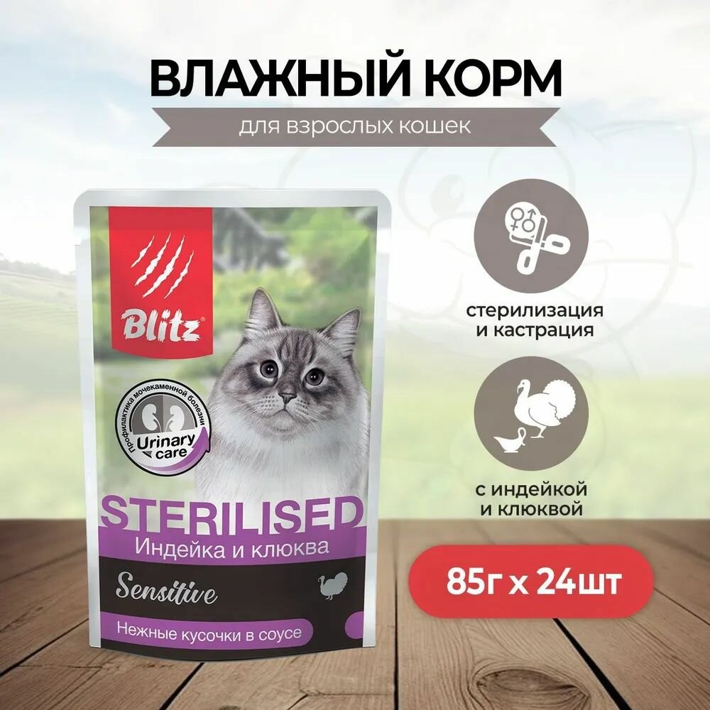 для стерилизованных и кастрированныхиндейка и клюква кусочки в соусе пауч 85г Blitz