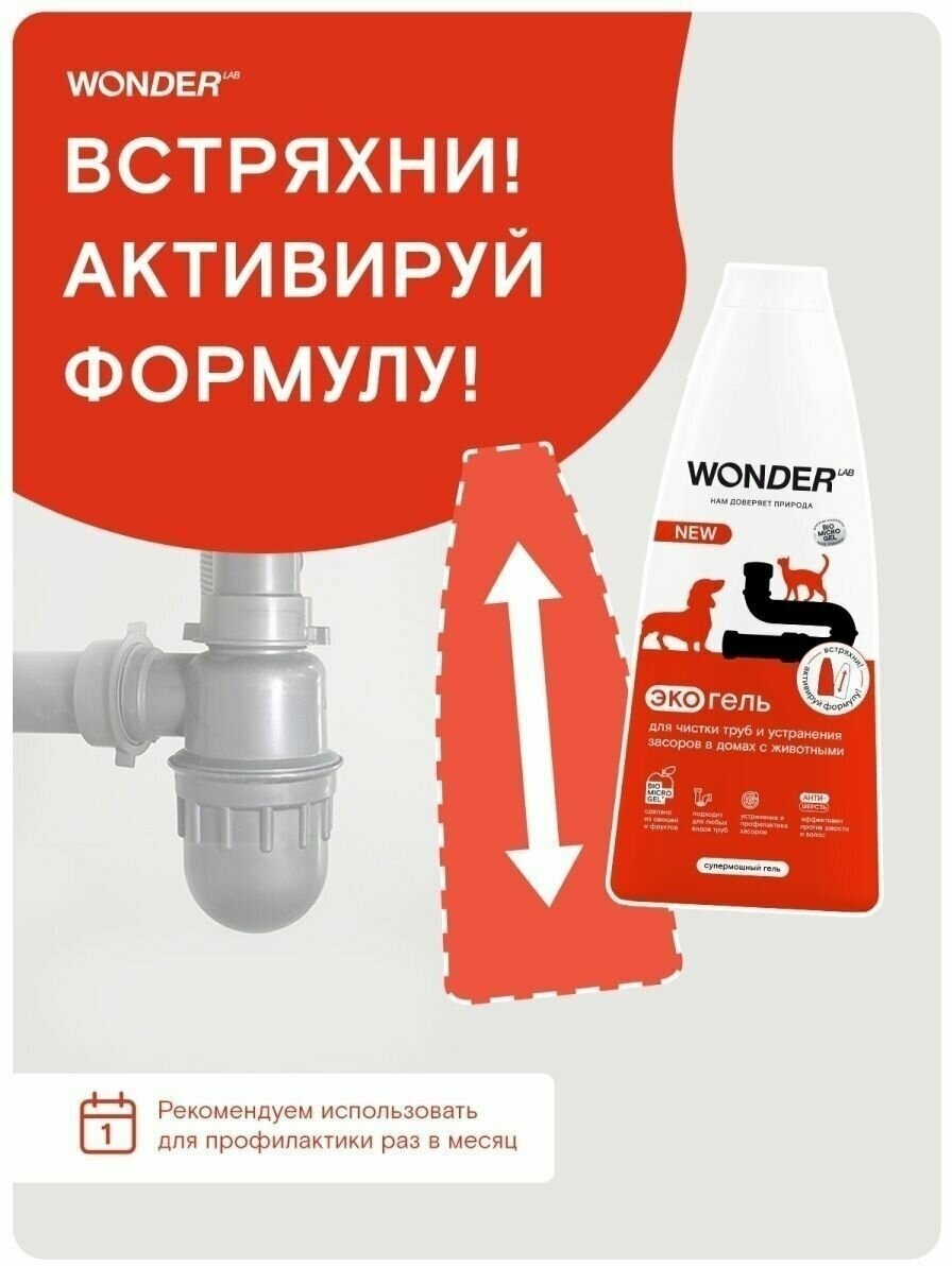 Средство для очищения труб и устранения засоров, которое не навредит трубам в доме и природе. Специально разработанное средство для очищения труб и сливов от шерсти домашних животных. Средство для труб удалит остатки волос, пищи и другие загрязнения в трубах и сливах. Средство для засоров подходит для любых типов труб, не разрушая их и не нарушая работу септиков. Благодаря формату густого геля средство экономично: лучше удерживается на поверхности, тем самым медленнее стекает по трубе, эффективнее уничтожая микробы и бактерии и тщательнее очищая внутреннюю поверхность трубы от самых стойких загрязнений. Средство без остатка уходит по стокам после смыва горячей водой. Рекомендуется использовать гель не только для устранения засоров, но и для профилактики раз в месяц. Перед применением обязательно встряхните, чтобы активировать формулу.