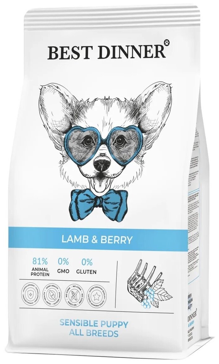 Высококачественный полнорационный корм супер-премиум класса для щенков всех пород с 1 месяца, беременных и кормящих собак Best Dinner с ягненком и ягодами создан специально для собак с особыми потребностями. В рецептуру добавлены ягоды – отличный источник антиоксидантов для укрепления иммунитета растущего организма, а также хондропротекторы, необходимые для правильного роста и развития опорно-двигательной системы. Нежное мясо ягненка обладает отличной усвояемостью и подходит для собак склонных к аллергическим реакциям и проблемами с пищеварением.